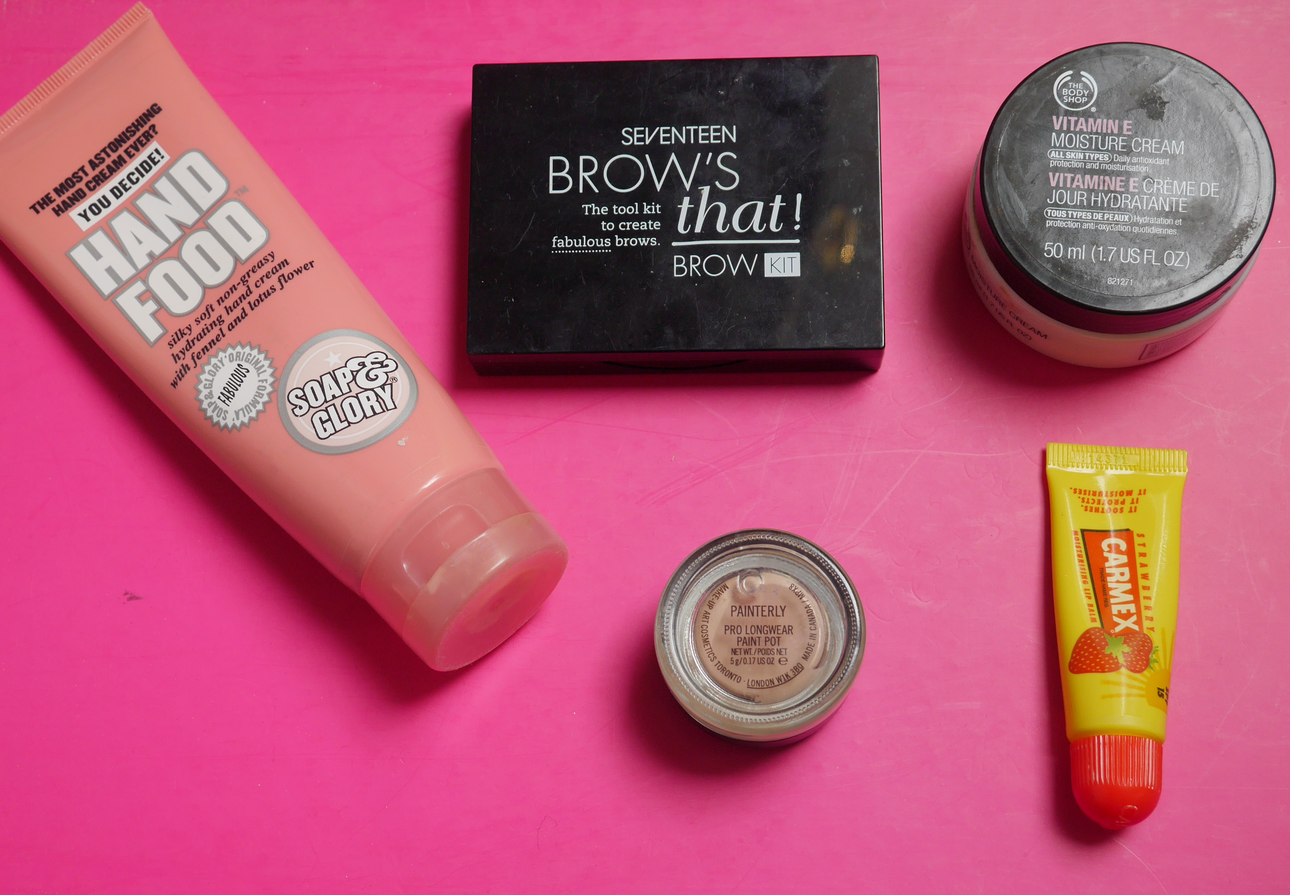 Soap&Glory Hand Food|Seventeen Brows That!|Body Shop Vitamin E Moisture Cream|Carmex Strawberry Balm|MAC Painterly Paint Pot.