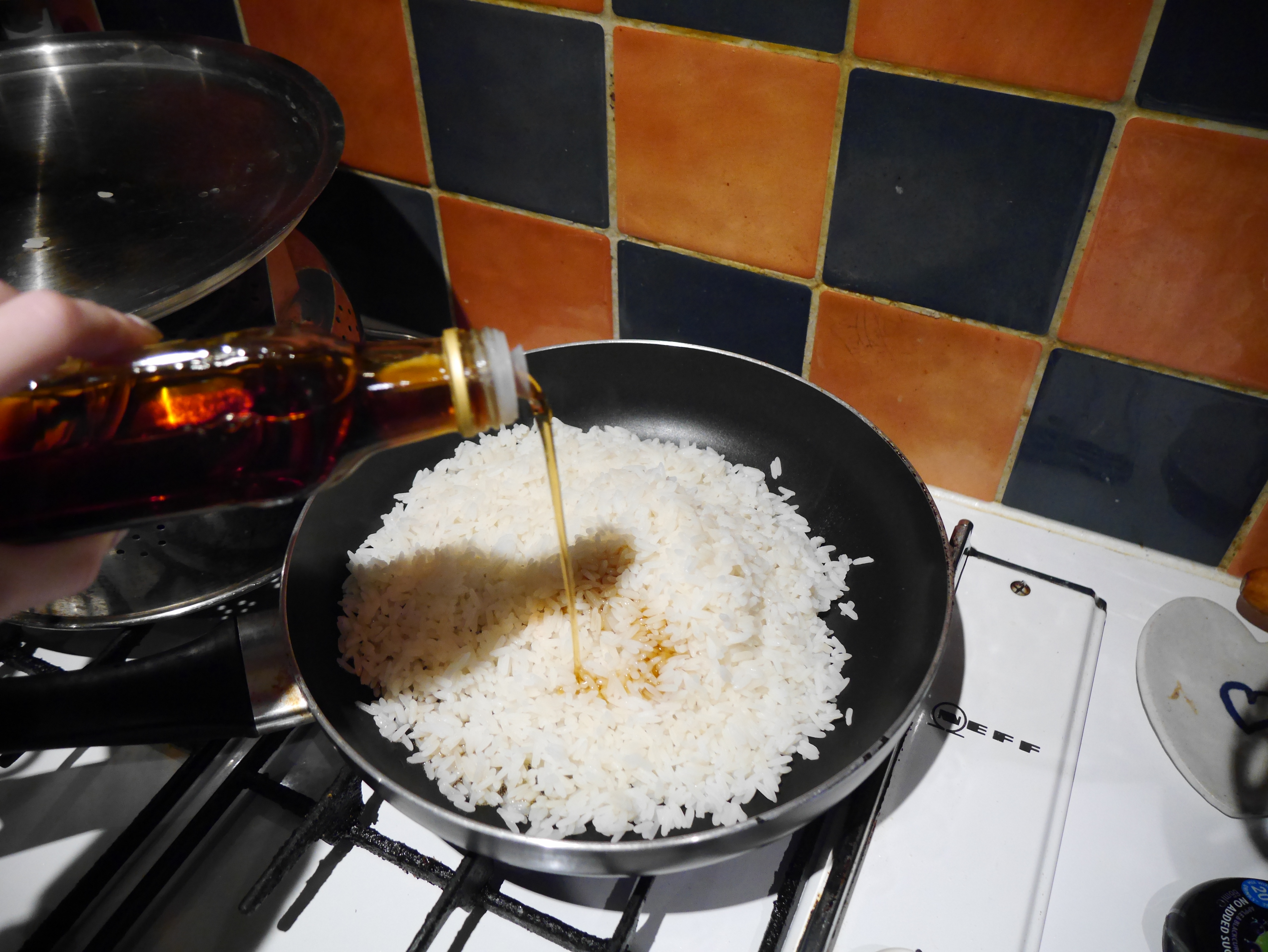 Whilst the chicken is cooking to to focus on the rice. Add rice to a hot oiled pan and if you want to pop a little bit of sesame oil over the top to add a little more flavour. Stir fry for around 3 minutes, depending on the heat of your pan.