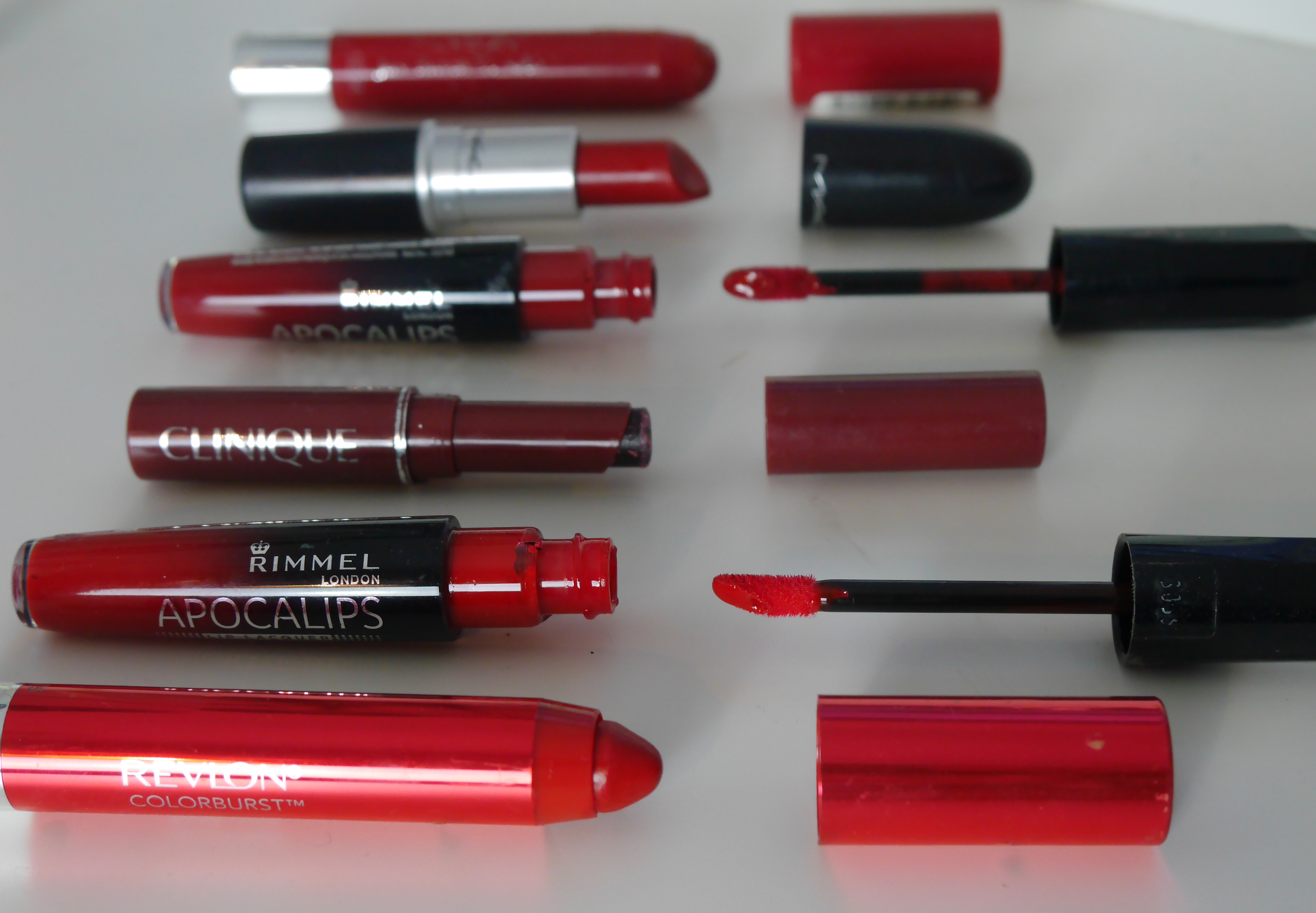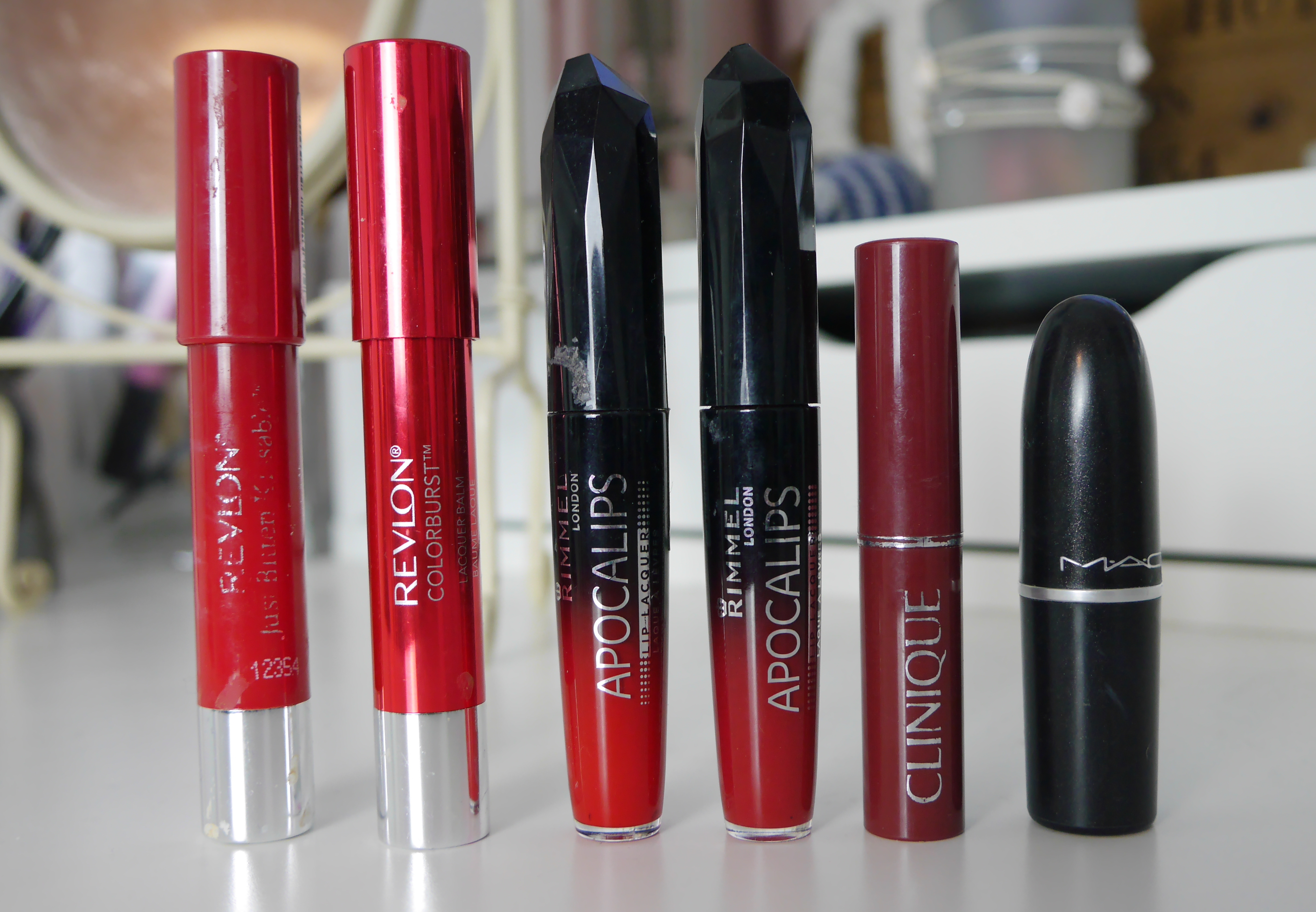 Revlon Colorburst Balm in Romantic|Revlon Colourburst Lacquer in Provacteur|Rimmel Apocolips in Big Bang|Rimmel Apocolips in Across the Universe|Clinique Almost Lipstick in Black Honey|MAC Satin in MAC Red.
