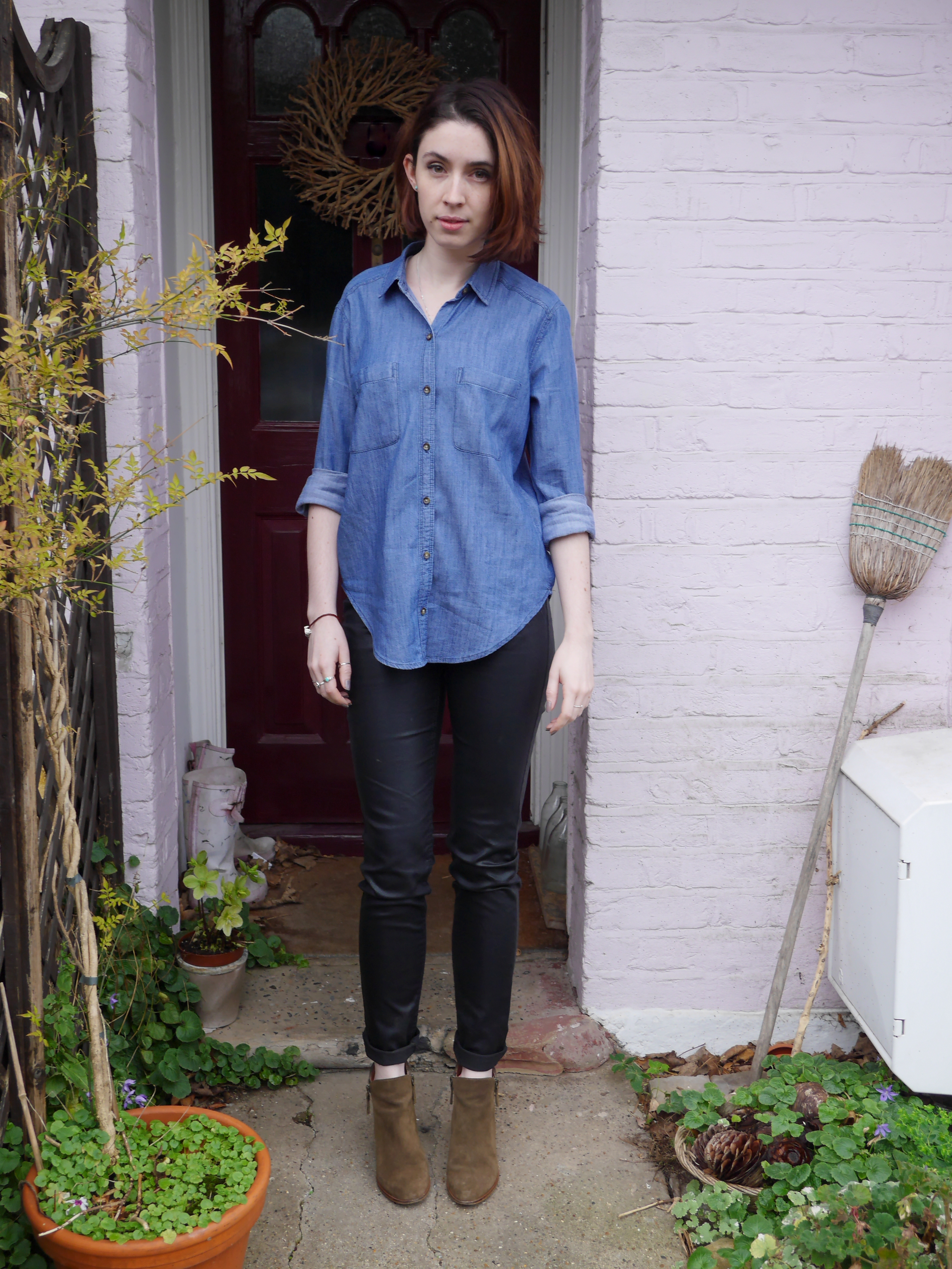 After a 14 hour shift and then an after party I wanted an outfit that was chic but comfortable.These coated jeans can jazz up any outfit and the shirt is super soft and comfortable.