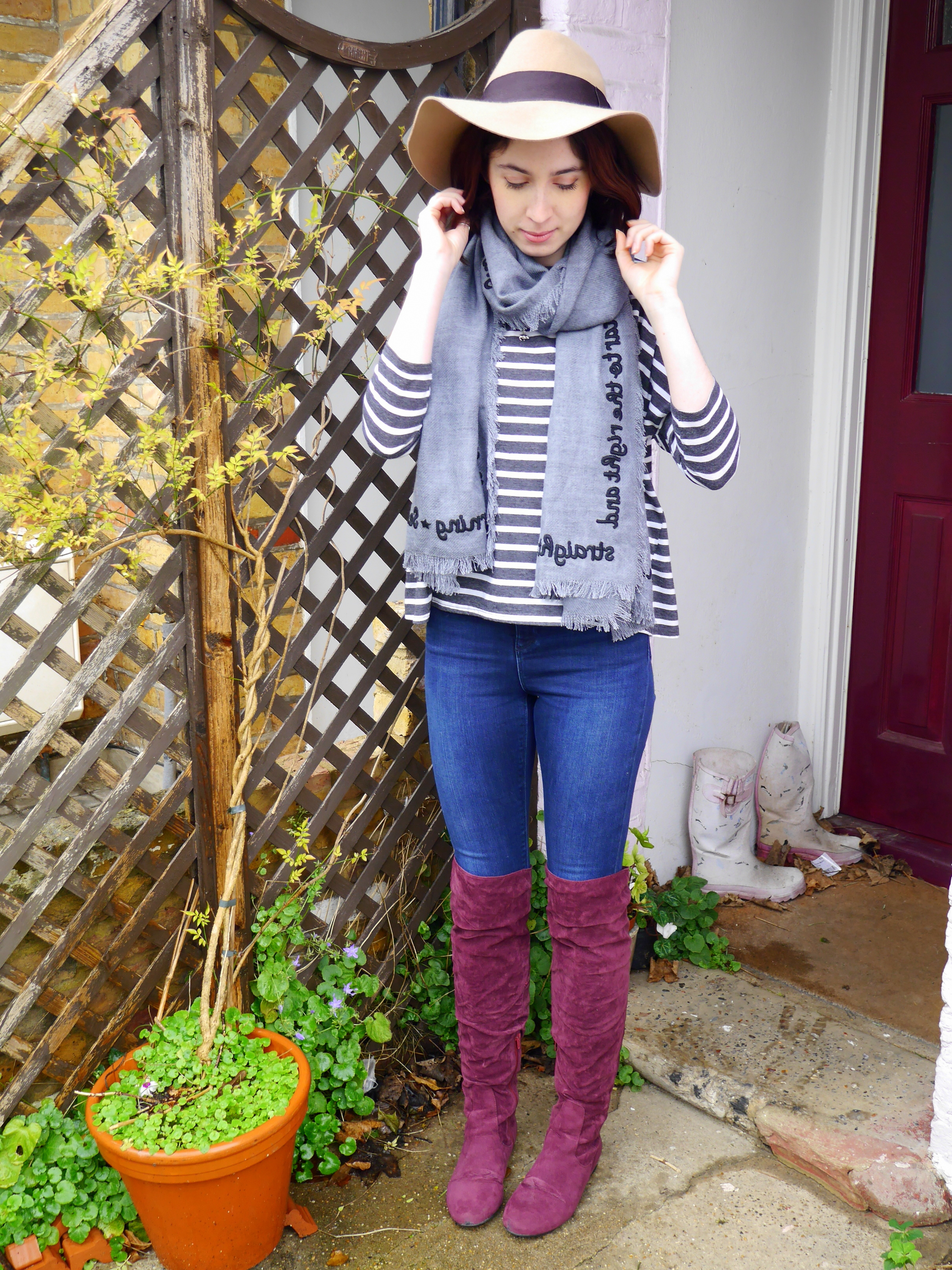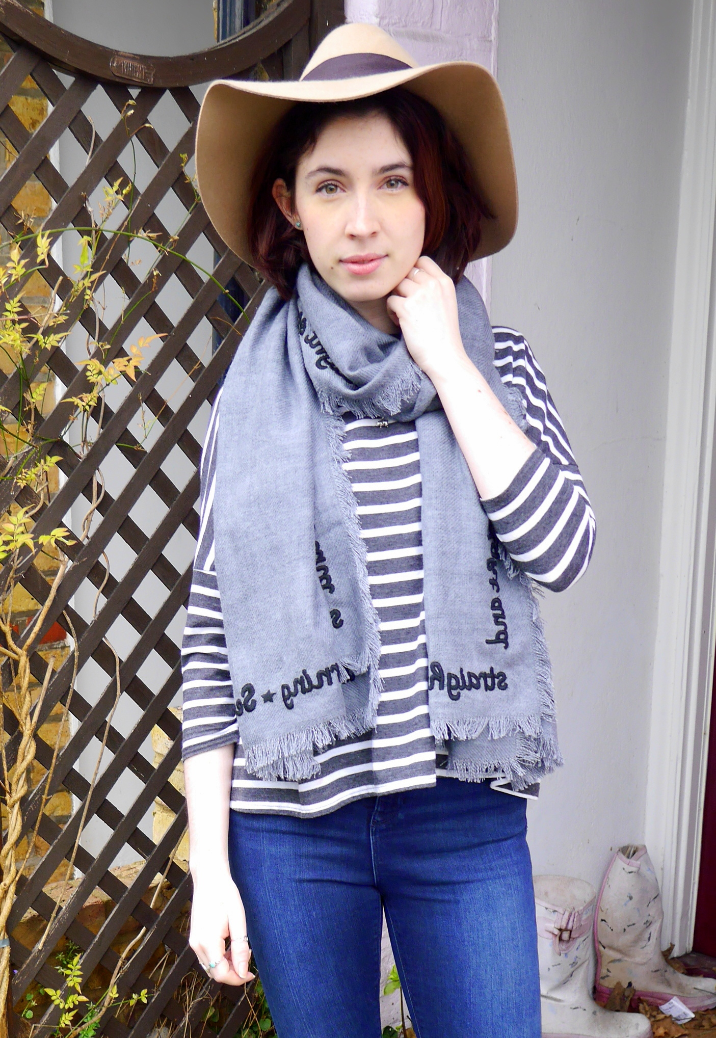 Top – Topshop (similar)|Jeans – ASOS|Boots – Daisy Street|Scarf – Hush|Hat – H&M.