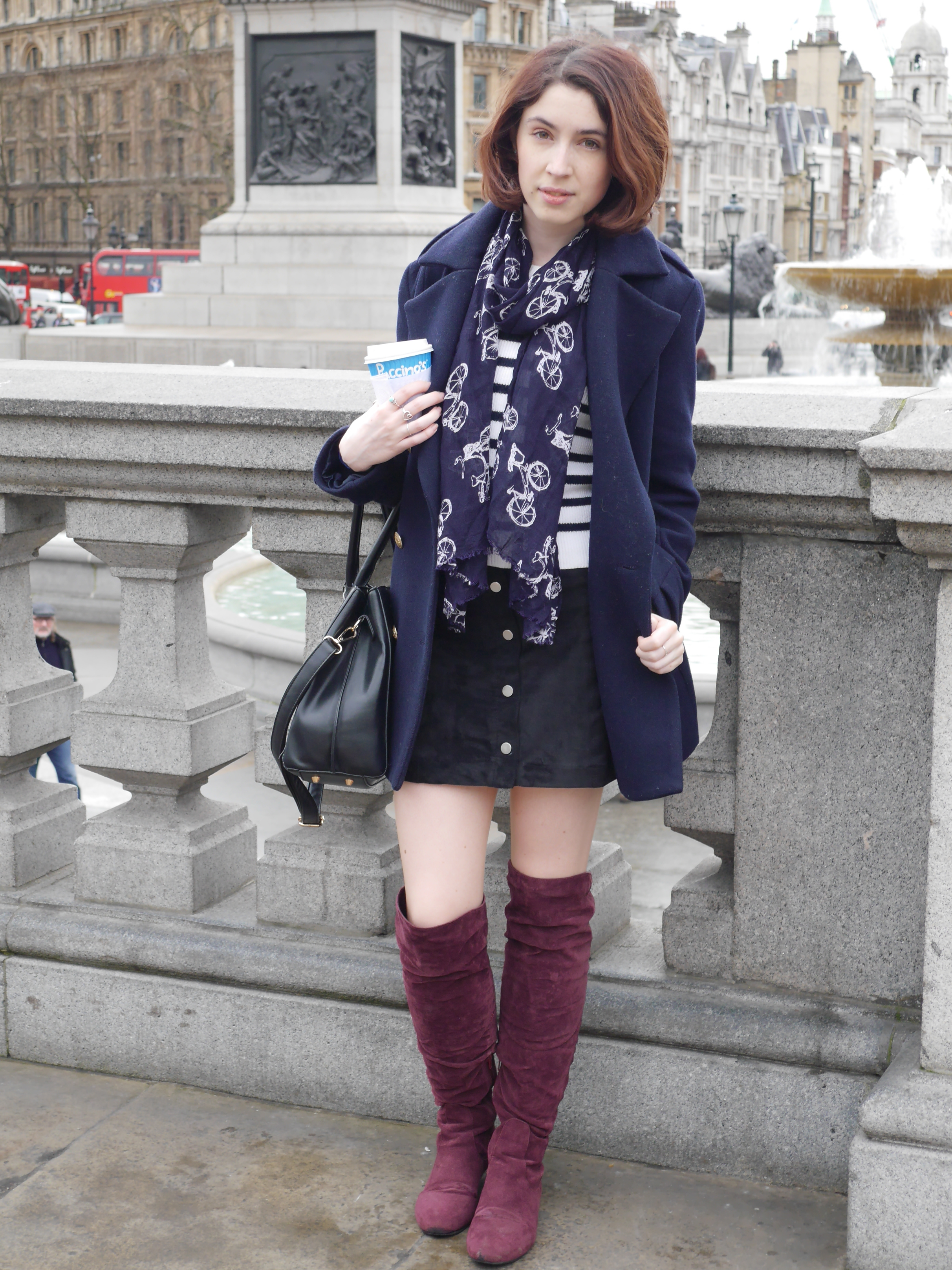 I must be mad wearing a skirt in this cold weather but I am loving this style and paired with my oxblood over the knee boots and a good thick coat you barely feel chilly winds. There is something rather parisian in this look but with a London twist.