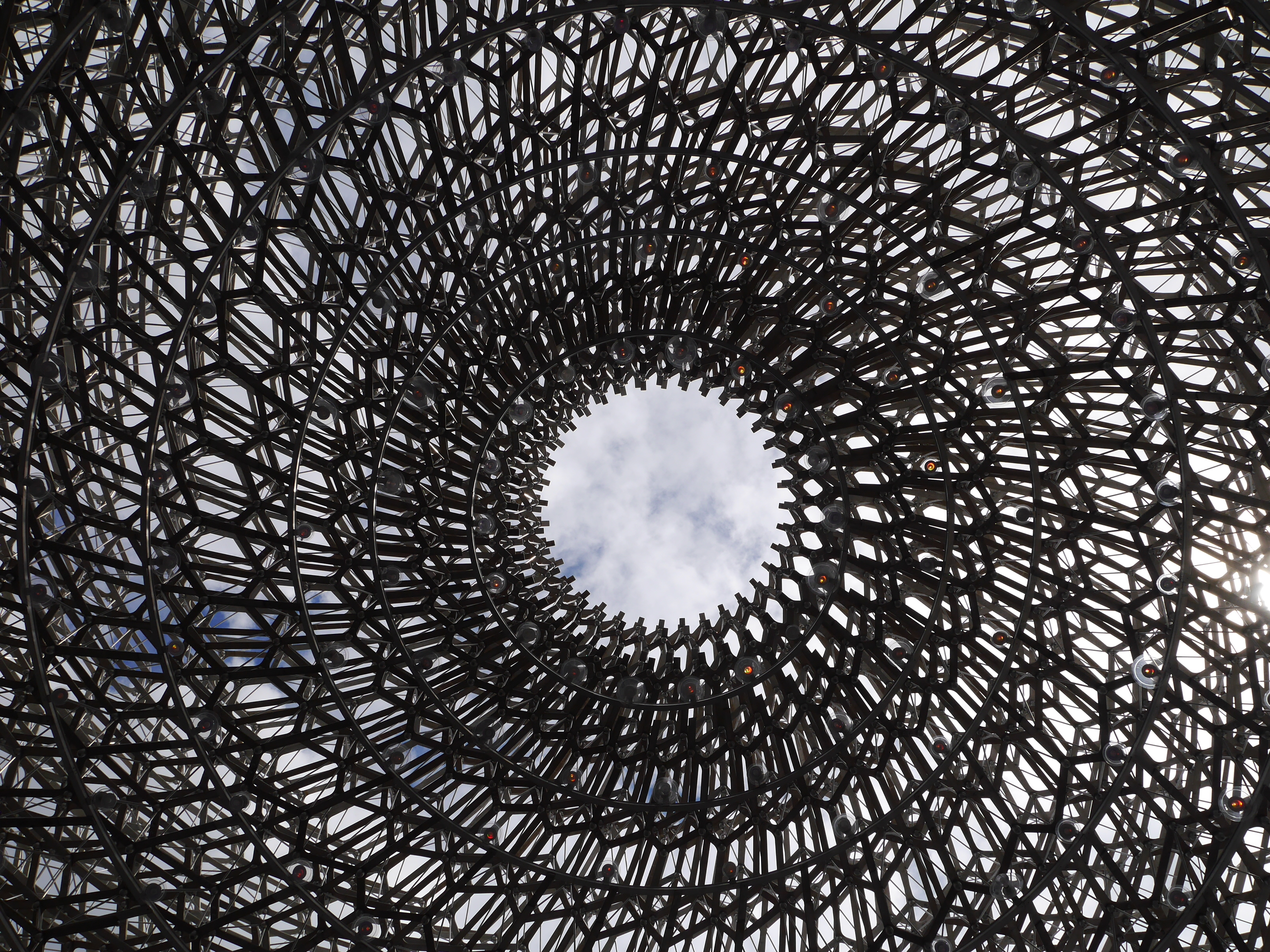 The Hive is a unique structure, inspired by scientific research into the health of bees. Designed by Wolfgang Buttress; the installation is made from thousands of pieces of aluminium which create a lattice effect and is fitted with hundreds of LED lights that glow and fade as a unique soundtrack hums and buzzes around you.