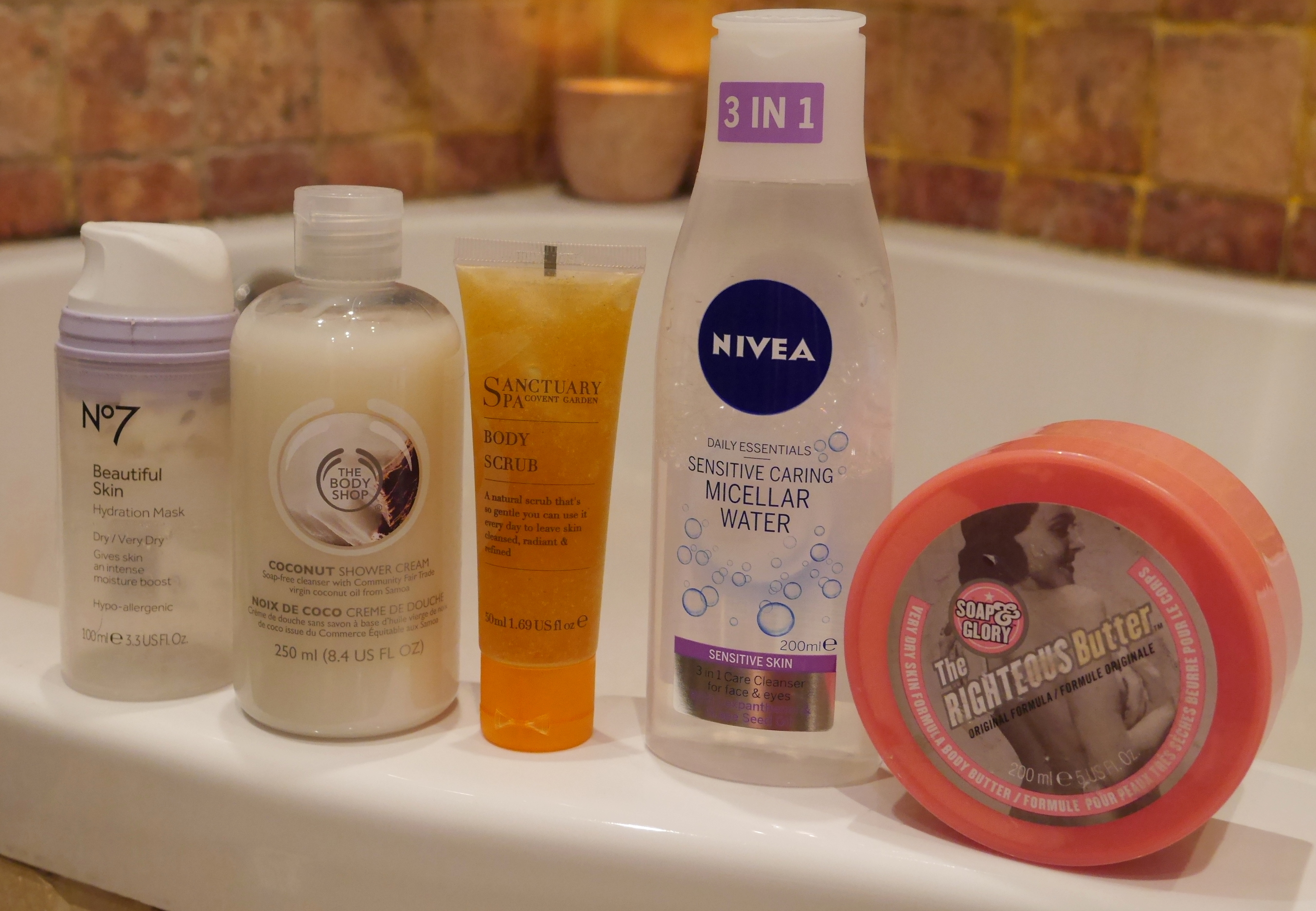 N07 Hydration Mask|The Body Shop Coconut Shower Cream|Sanctuary Spa Body Scrub|Nivea Micellar Water|Soap&Glory The Righteous Butter.