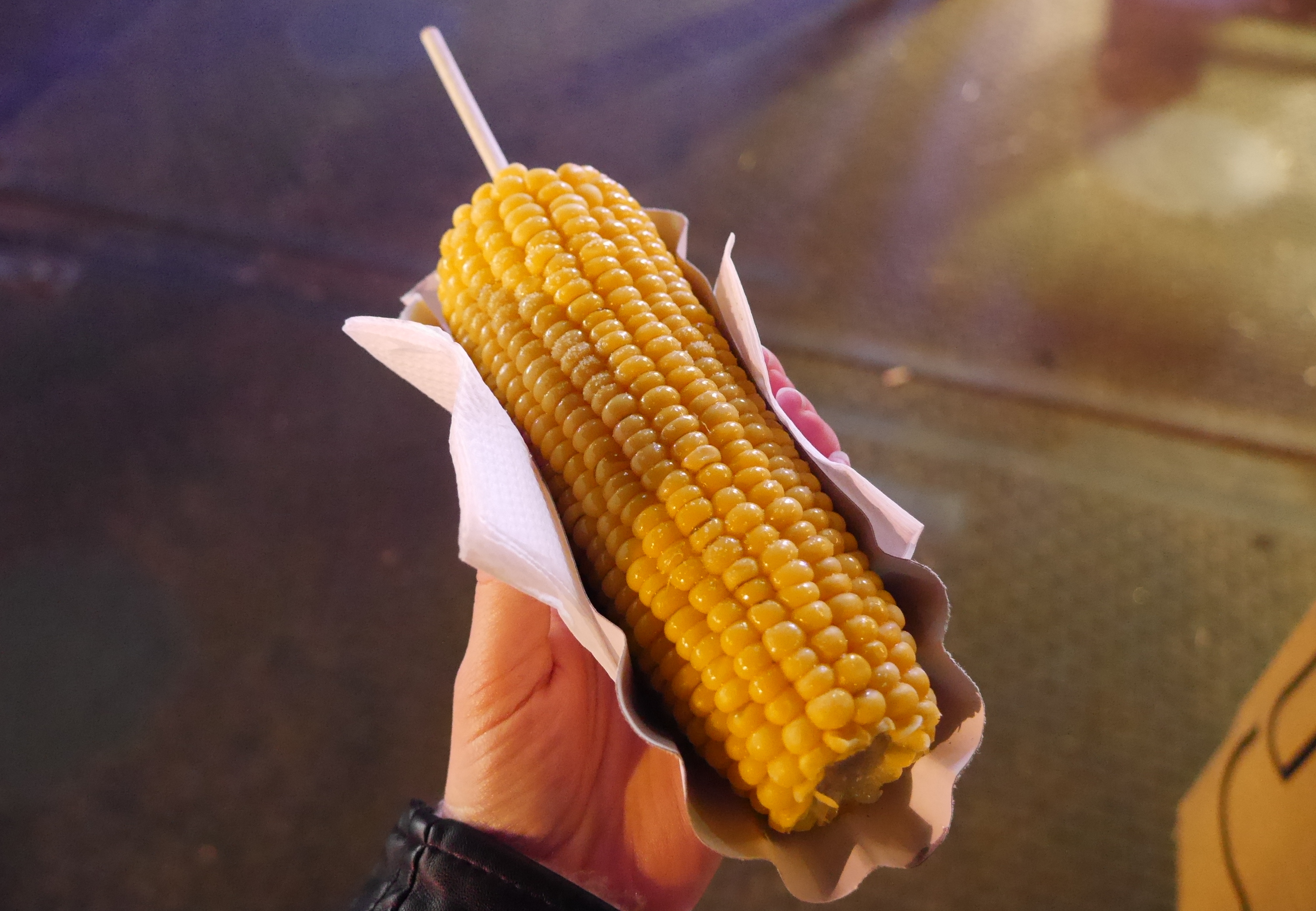 We got a little peckish so wove our way back to the Bavarian Village to check out some of the food stands, mostly offering Bratwurst but there are also some sweet treat options like mini doughnuts or churros. I however decided to go of a corn on the cobb that was as big as my head and smothered in butter!