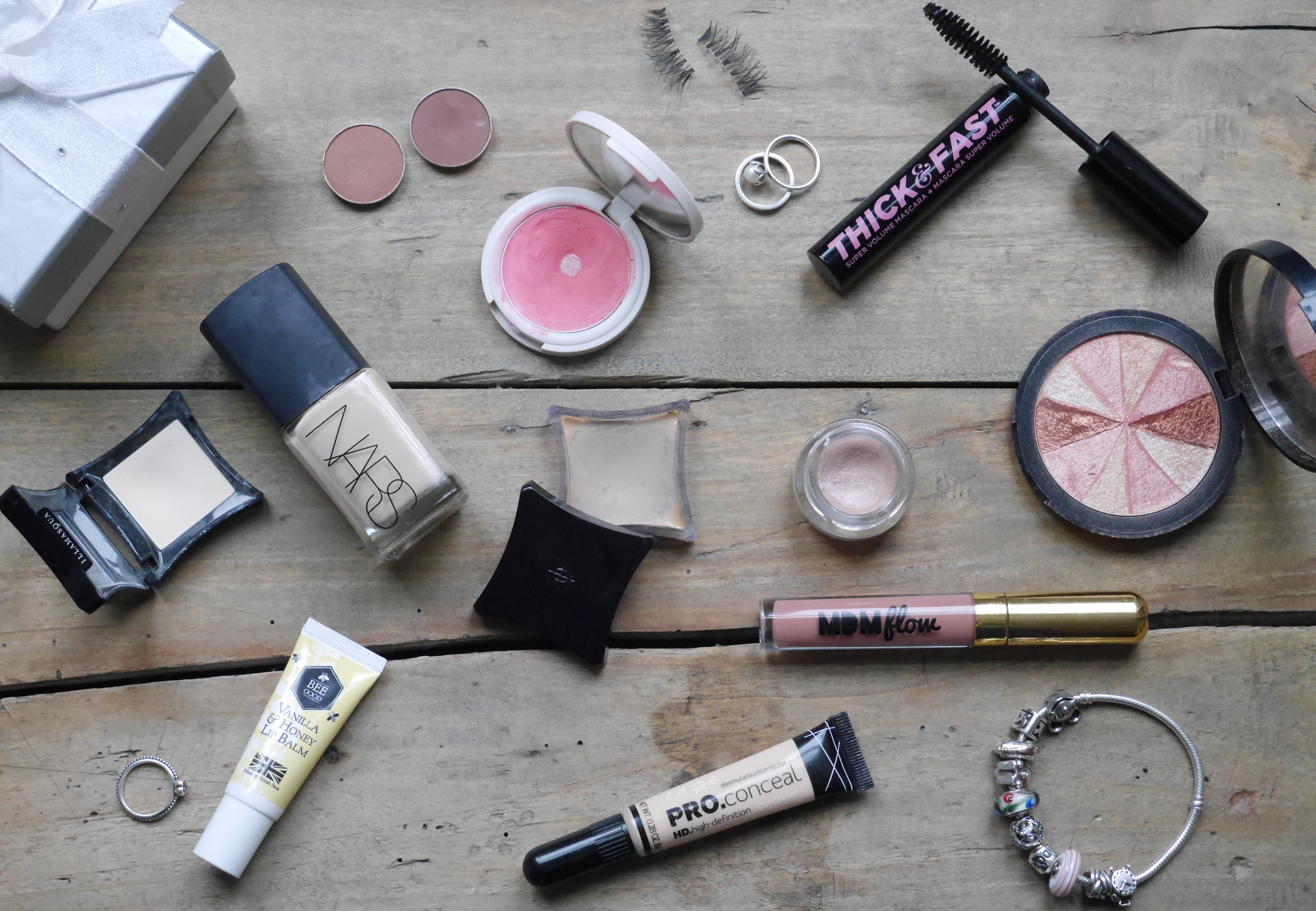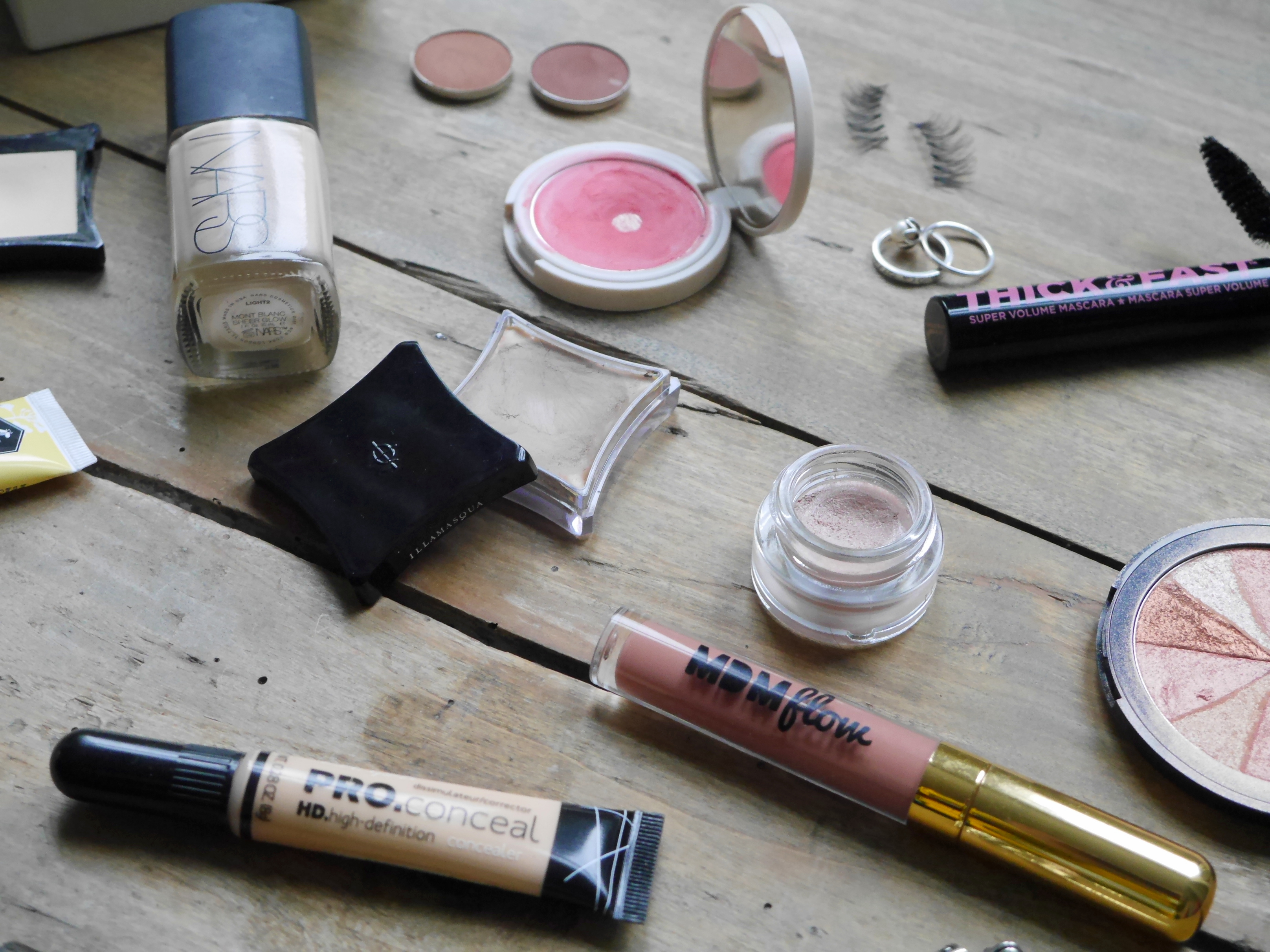NARS Sheer Glow|Makeup Geek Shadows|Topshop Cream Blush|Soap&Glory Thick&Fast Mascara|Soap&Glory Peach Party|Illamasqua Vintage Metallix|Illamasqua Hollow|Illamasqua Stealth|Bee Good Lip Balm|LA Girl Pro.Conceal|MDM flow Liquid Lipstick.