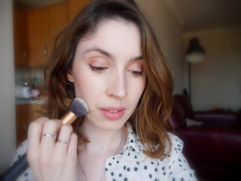 I prefer to apply mine with the Real Techniques Buffing Brush because it tends to lift off with a beauty blender,but if you’re more of a hands on kinda of a person then this product works really well with your fingertips.