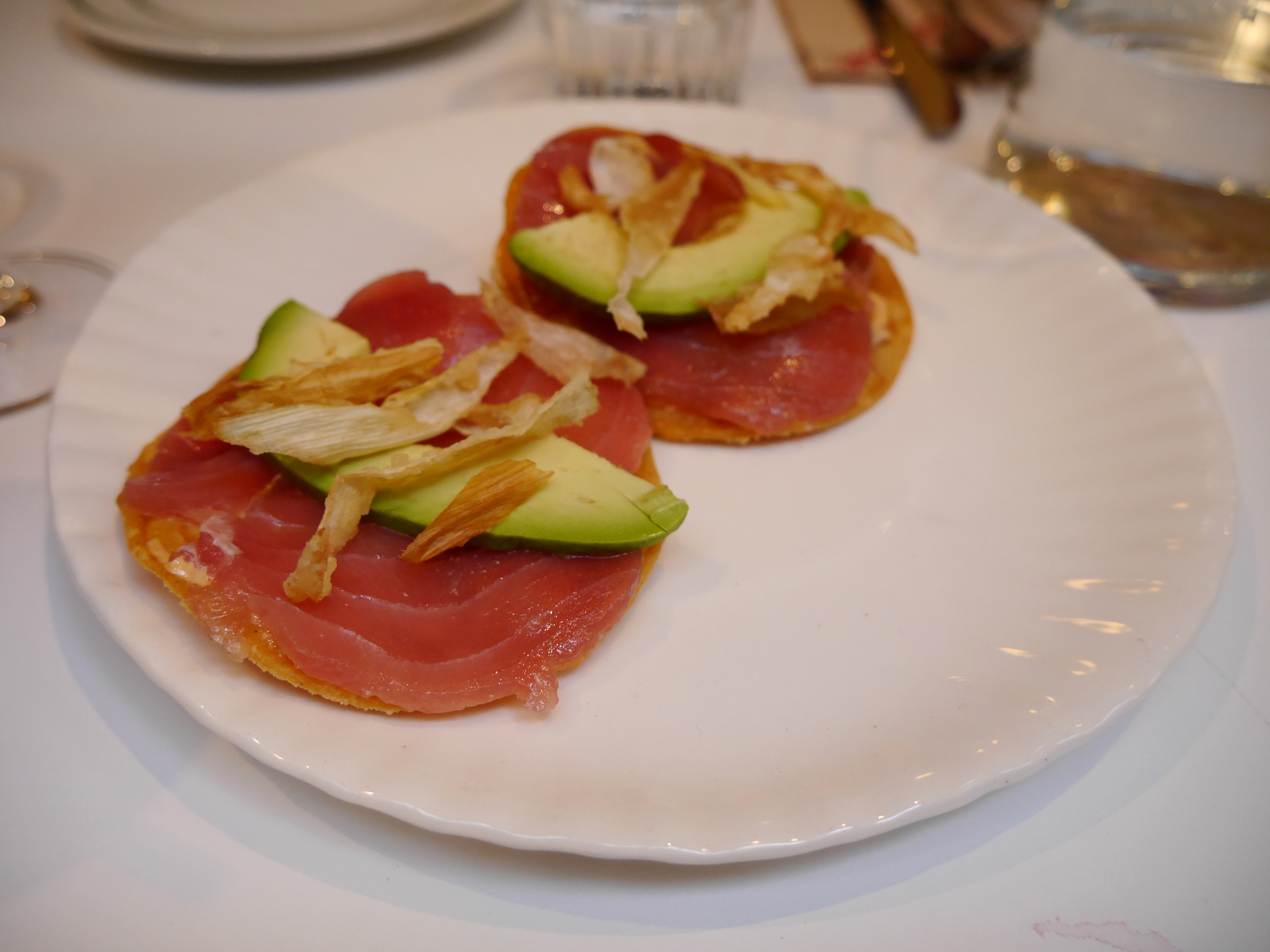 Contramar Tostadas; marinated yellowfin tuna, chipotle mayo, crispy leeks, avocado. Super fresh and a great mix of textures.