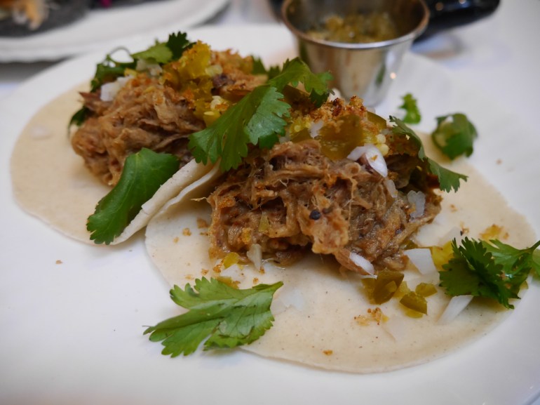 Beautiful juicy Carnitas Taco’s; slow cooked pork belly & collar, in a marinade of o.j., Mexican oregano, cinnamon & garlic,served with crispy pork skin, pickled jalapeno & salsa verde.