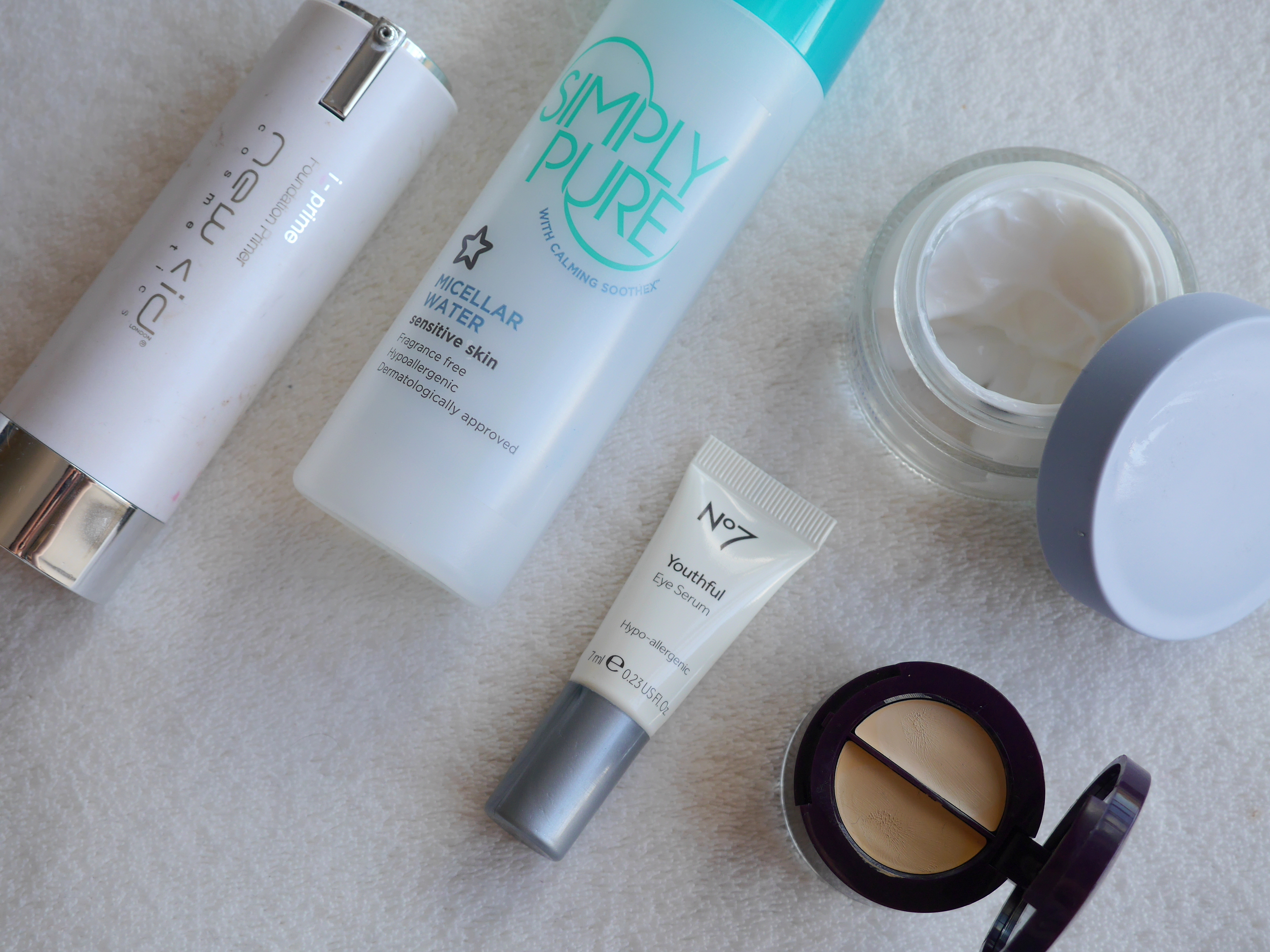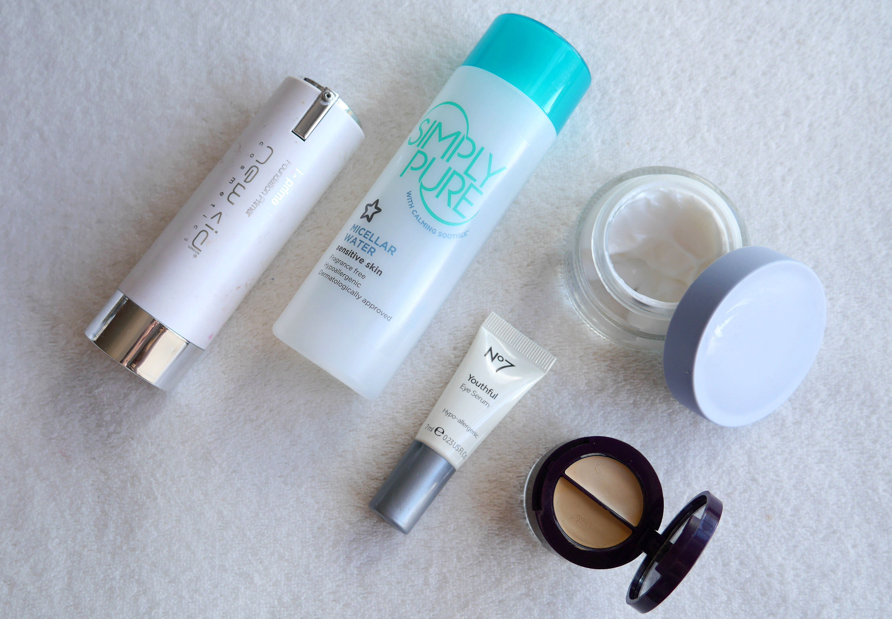 New Cid i-prime|Superdrug Micellar Water|No7 Youthful Eye Serum|M&S Pure Beauty Night Cream|Wild About Beauty Smooth Cover Concealer.