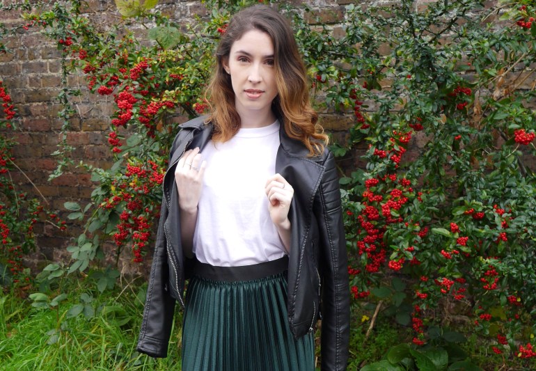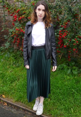 This was the biggest challenge but my favourite outfit. The metallic colour makes it instantly look like a party outfit so I had to pair it with very simple items to really make it more casual. I chose a plain white t-shirt which wasn’t too fitted and then my battered converse, a black t-shirt made it look slightly too dressy but looked great for a more smart casual look. The jacket tied everything together and made it have a slightly more edgy look but I would happily wear it without, if the weather was a little warmer.
