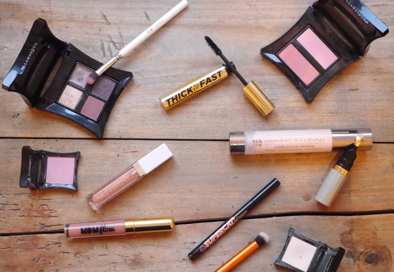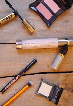 Illamasqua Complement Palette|S&G Thick and Fast Mascara|Illamasqua Blusher Duo|Illamasqua Powder Eyeshadow in Ditzy|New Cid i-gloss|MDM Flow Liquid Lipstick|S&G Supercat Liner|Urban Decay Optical Illusions Primer|ReCover Cosmetics Concealer|Illamasqua Powder Eyeshadow in Stealth|ABH Modern Renaissance Palette (not picture)|Illamasqua Hollow (not pictured).