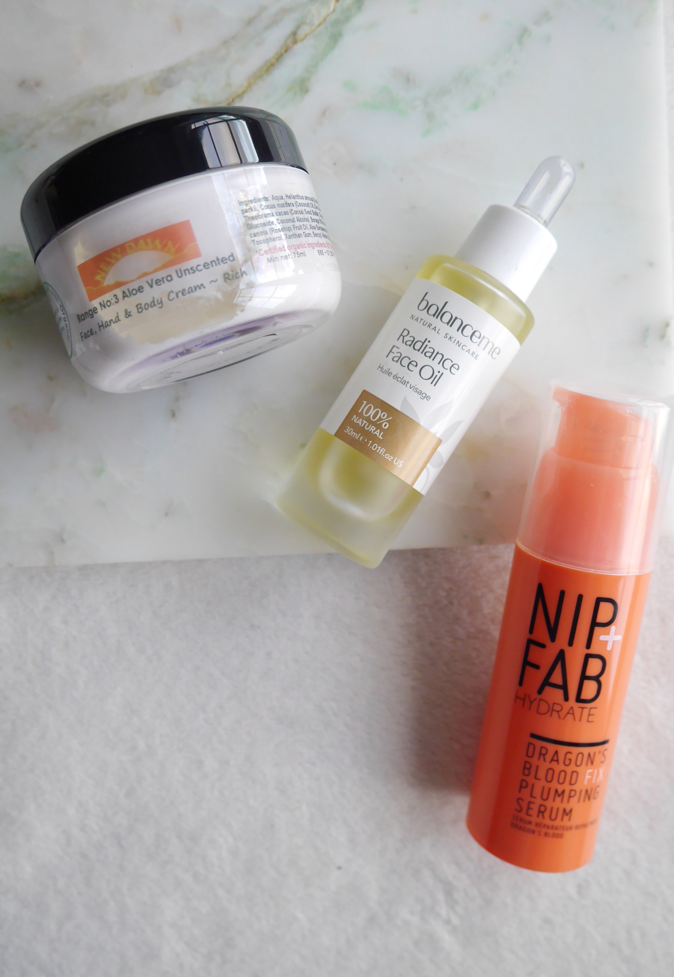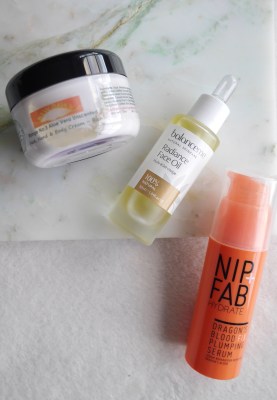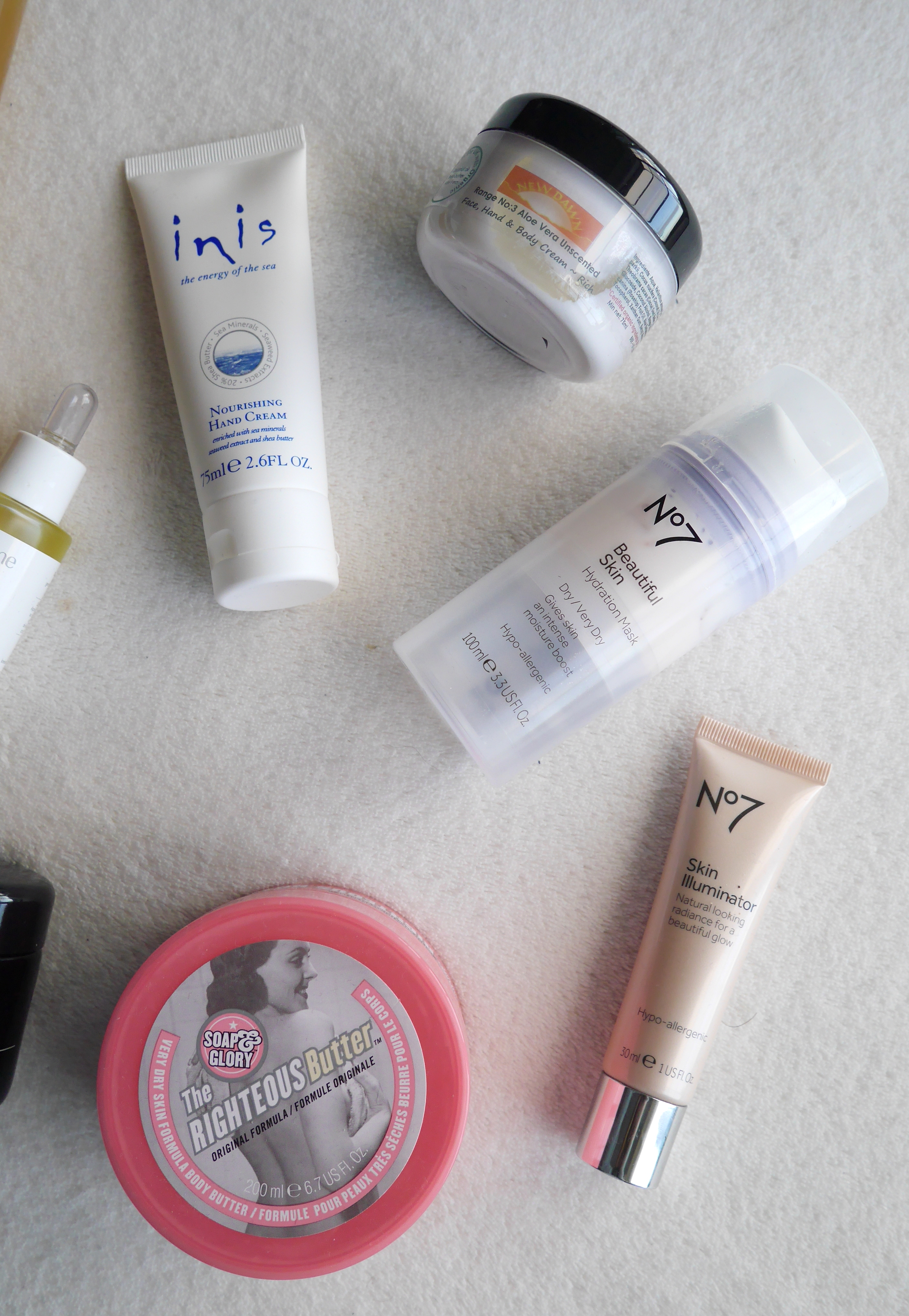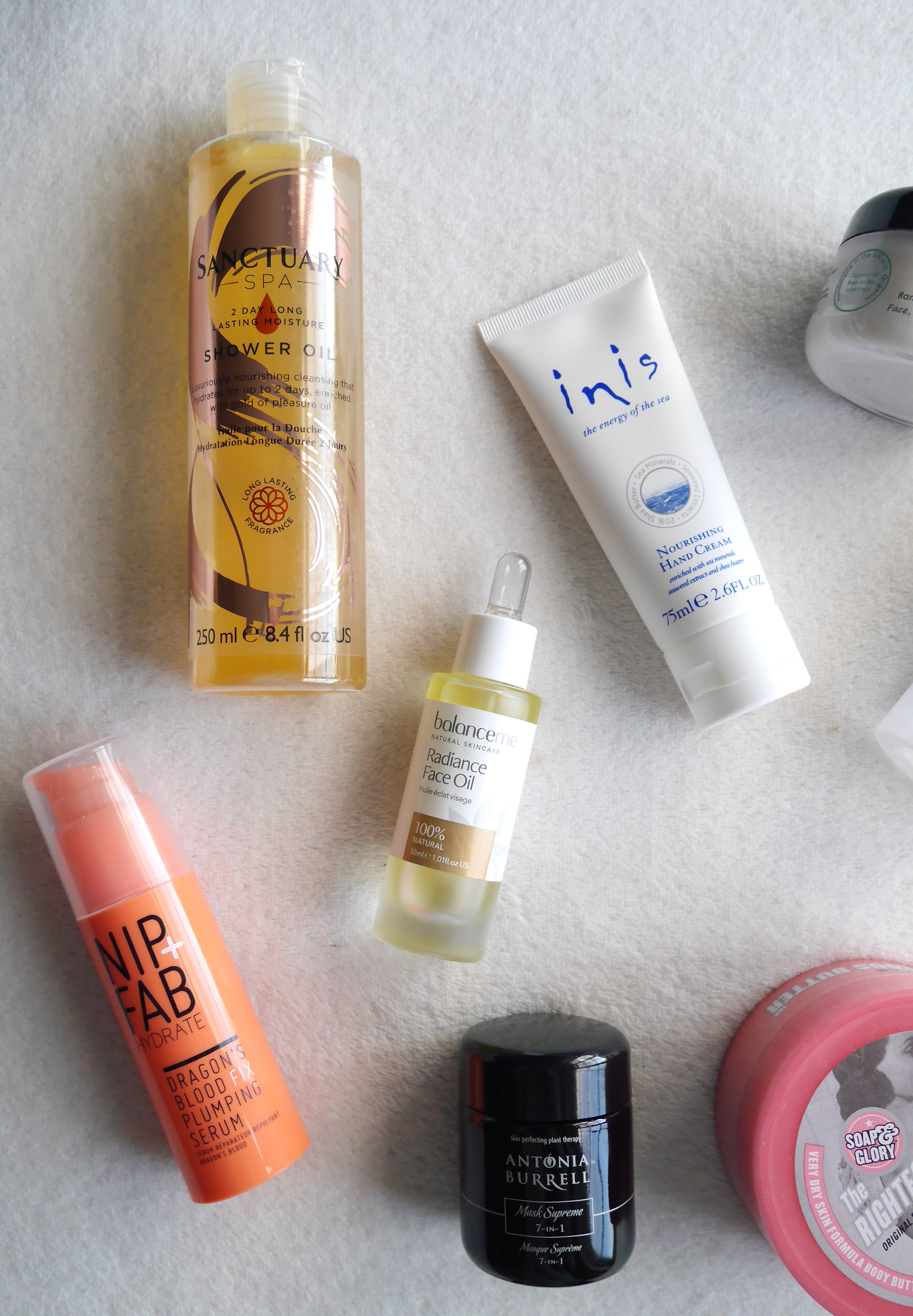 Inis Nourishing Hand Cream|New Dawn Rich Cream*|No7 Beautiful Skin Hydration Mask|No7 Skin Illuminator|Soap&Glory The Righteous Butter|Sanctuary Spa Shower Oil|Balance Me Radiance Facial Oil|Nip+Fab Dragons Blood Fix Plumping Serum|Antonia Burrell Mask Supreme 7 in 1.
