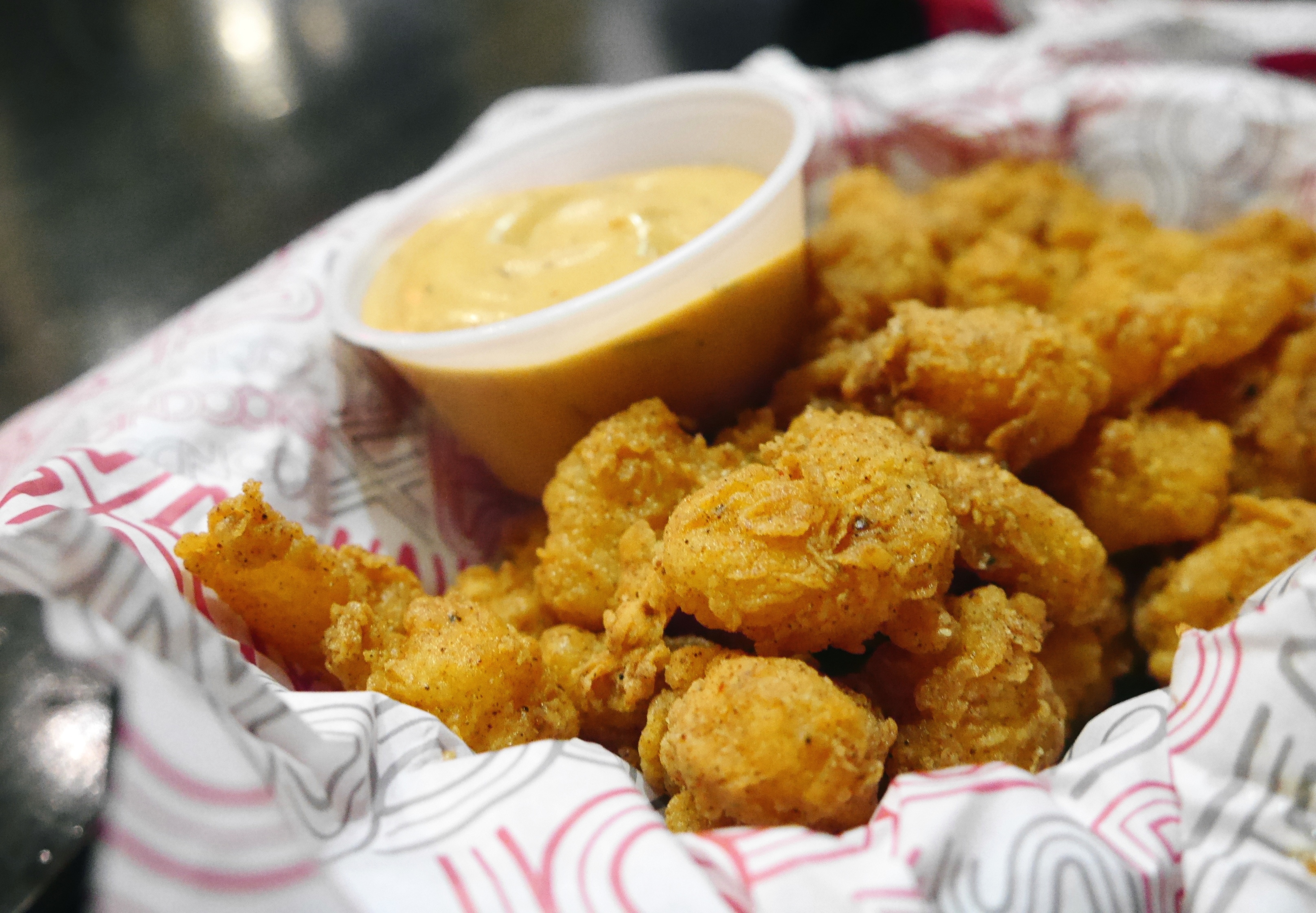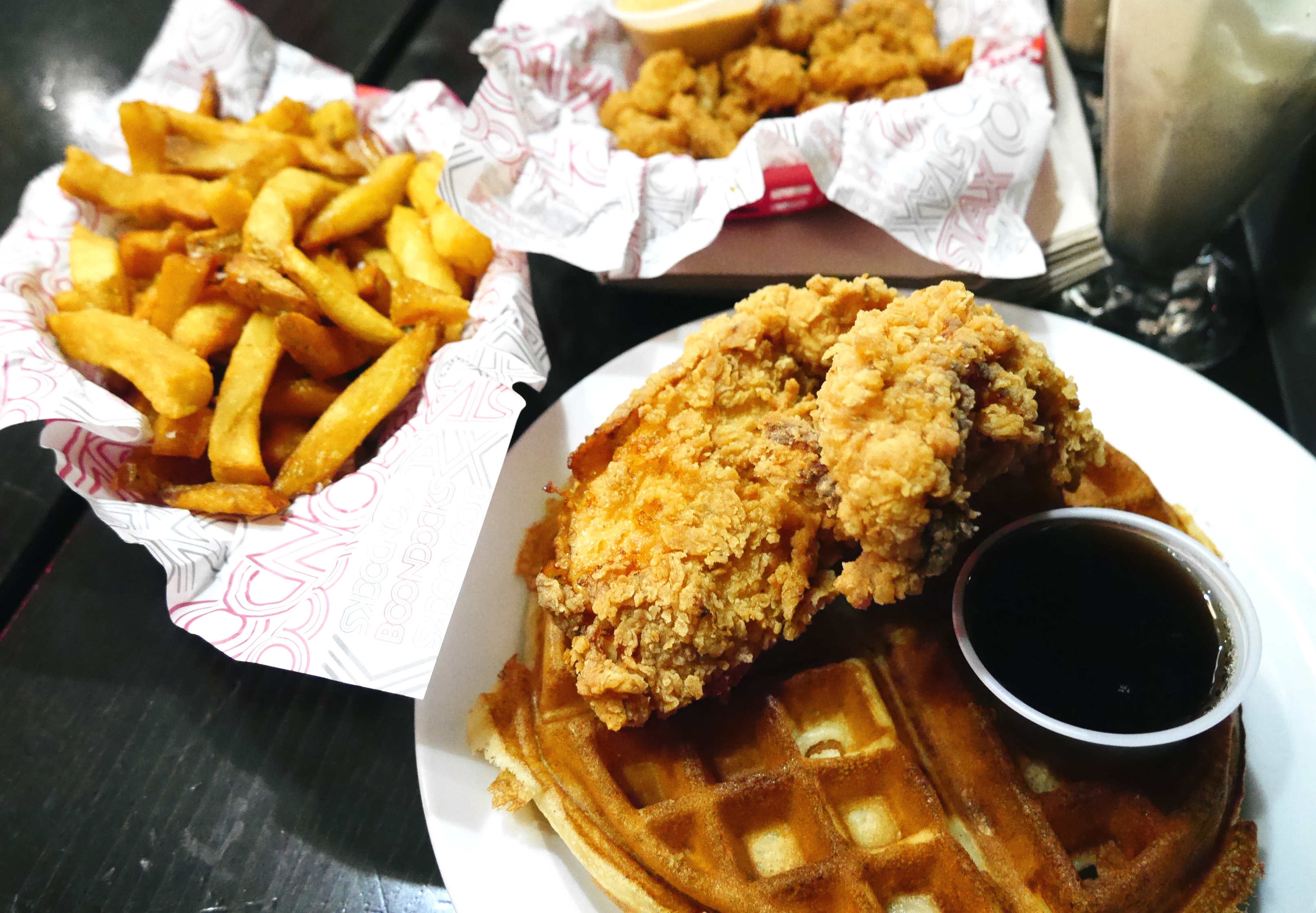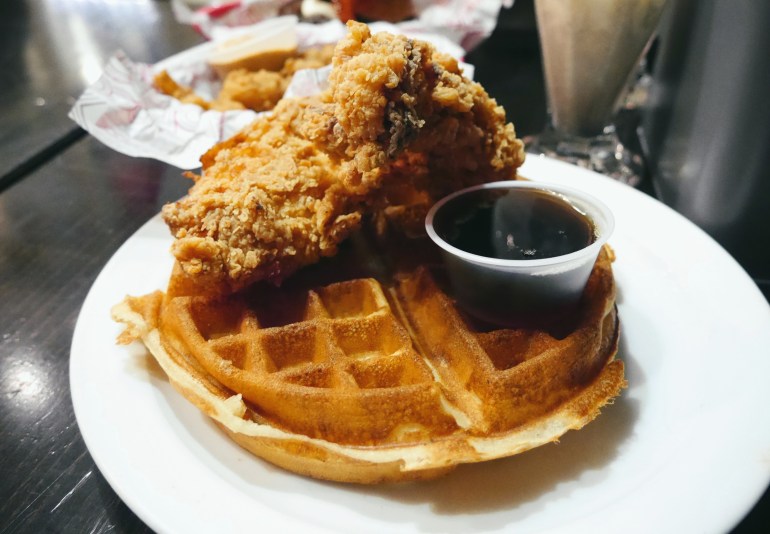 This is not a restaurant for health conscious people as the only green in sight are the pickles but the food is bloody delicious. One of you has to get the Chicken and Waffles the perfect combination of sweet and savoury but I would also recommend the The Big Stax Burger; juicy beef burger topped with spicy ‘comeback’ sauce, housemade dill pickles, maple glazed beef bacon, caramelised onions, and cheese. Make sure you leave room for some Popcorn Shrimp, bite size pieces of joy!