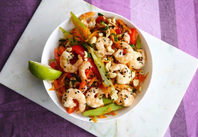 Once the prawns are cooked plate everything up, scatter a few extra sesame seeds and chopped peanuts on top, add a wedge of lime for added zing and serve. Possible one the easiest dishes ever. Packed full of protein, vitamins and low in saturated fats. If you’re not a big seafood fan then thin strips of chicken would also work or Quorn pieces if you want to keep it veggie.