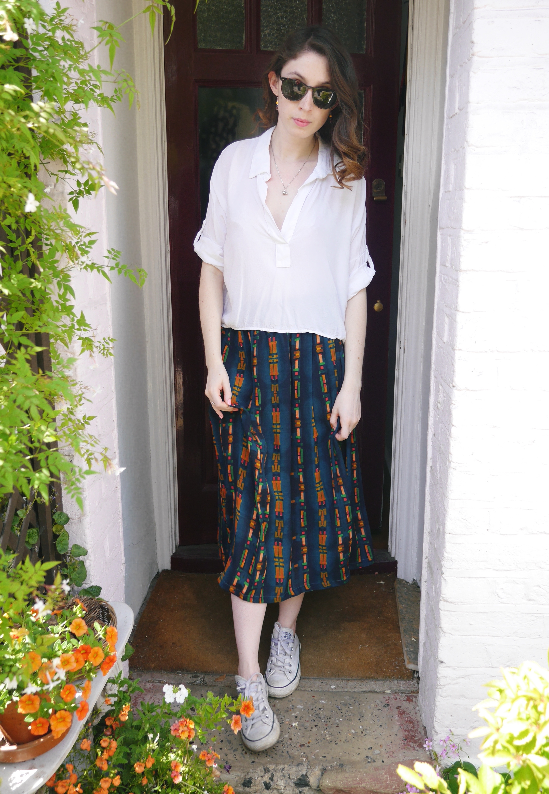 Skirt – Anthropologie|Shirt – Brandy Melville (similar)|Shoes – Converse via Office|Sunglasses – Ralph Lauren (similar).