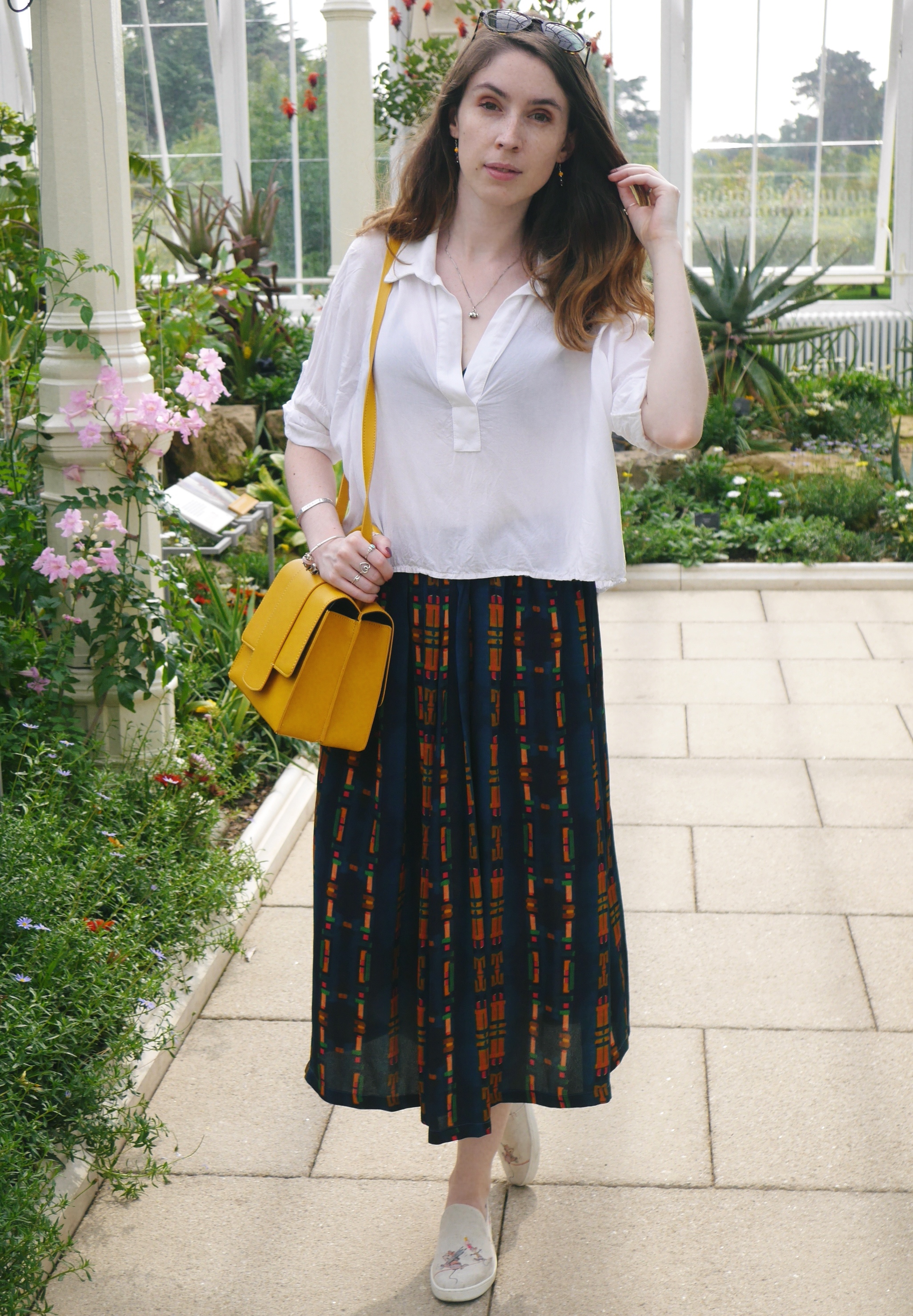 Shirt – Brandy Melville (similar)|Skirt – Anthropologie (similar)|Shoes – Toms|Bag – House of Fraser (similar)|Sunglasses – Ralph Lauren (similar).