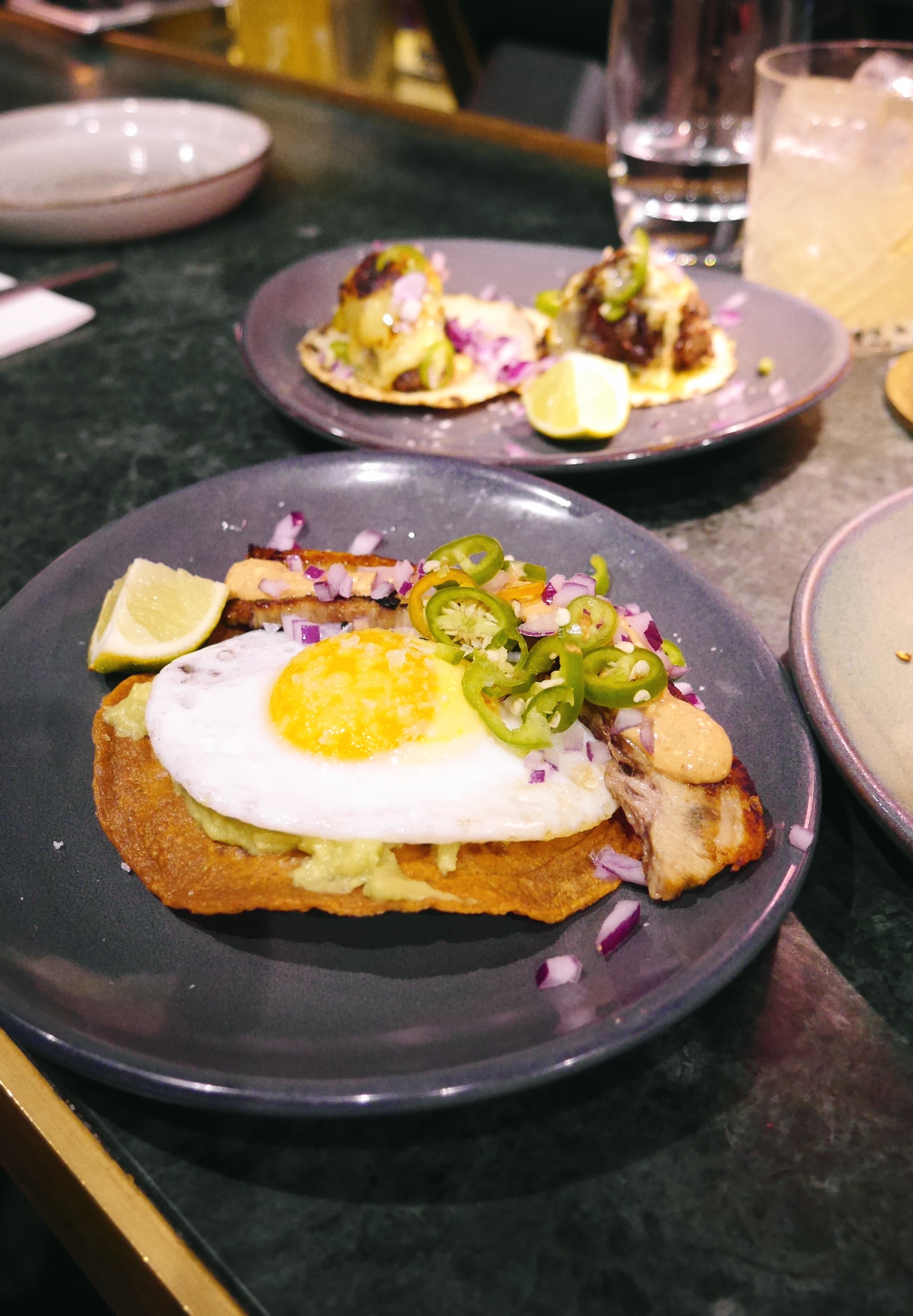 The food is largely non traditional South American with a few twists and turns in the menu so we started off with some delicious sharing bites. Duck Egg & Bacon Tostadas, Torched Mackeral & Avocado Tostadas and Aged Cheeseburger Tacos. Full of flavour, amazing spice combinations and interesting textures, all quite spicy but the cocktails took the edge off. I only wish we had tried the Lamb Fat Popcorn.