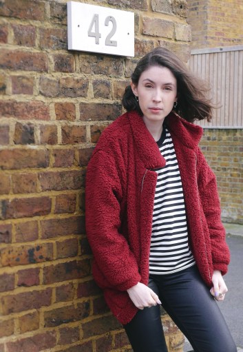 I haven’t worn this much black in about 2 years, but I loved this top from SHEIN so much that I couldn’t wait to style it – I know shock horror Kate is wearing a striped top. I love the little red heart in the corner which adds a subtle pop of colour and helped pull the jacket into the outfit. It’s the perfect casual piece for your winter wardrobe and I can see myself wearing it with blue jeans or under my dungarees without a jacket as we head into spring time. If you’re not a fan of black and white it comes in various colours. One thing to note though is the fabric, it’s a spandex, polyester, cotton mix so does not have too much weight to it. I’ve got a thermal on underneath so if you live in the UK this is one for layering or just wait till the sun starts shining!