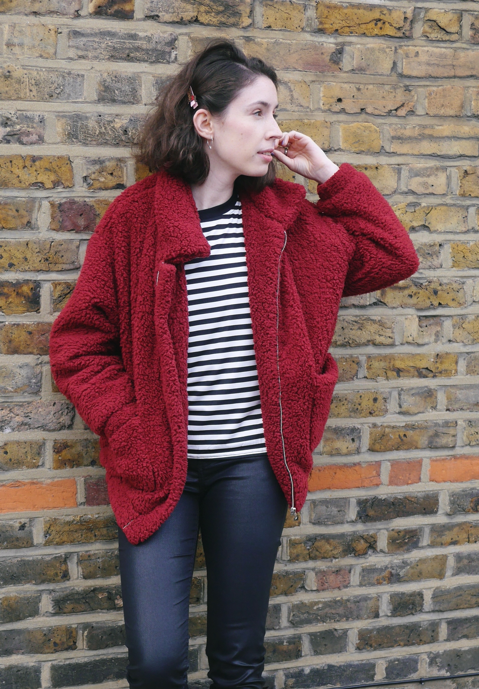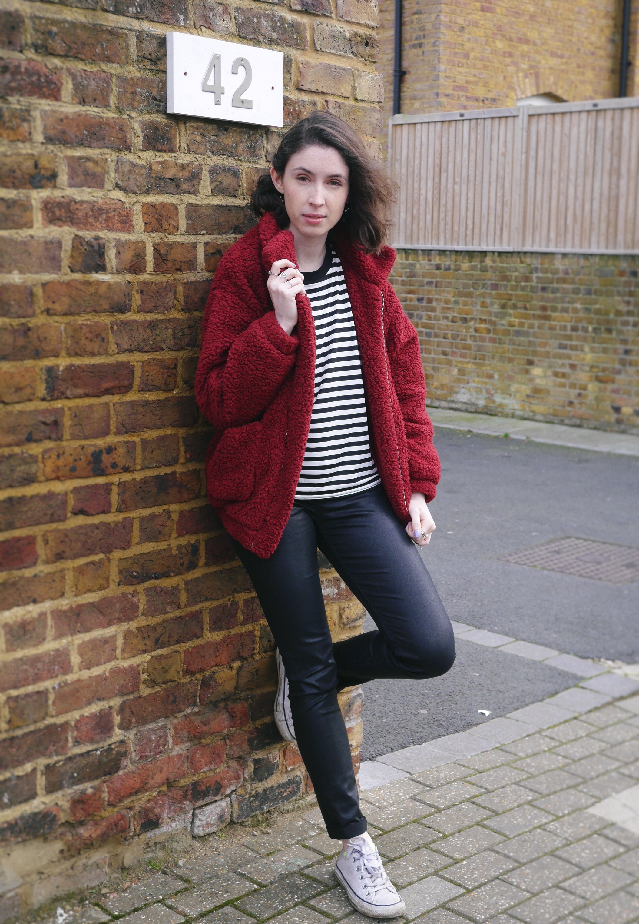 I haven’t worn this much black in about 2 years, but I loved this top from SHEIN so much that I couldn’t wait to style it – I know shock horror Kate is wearing a striped top. I love the little red heart in the corner which adds a subtle pop of colour and helped pull the jacket into the outfit. It’s the perfect casual piece for your winter wardrobe and I can see myself wearing it with blue jeans or under my dungarees without a jacket as we head into spring time. If you’re not a fan of black and white it comes in various colours. One thing to note though is the fabric, it’s a spandex, polyester, cotton mix so does not have too much weight to it. I’ve got a thermal on underneath so if you live in the UK this is one for layering or just wait till the sun starts shining!