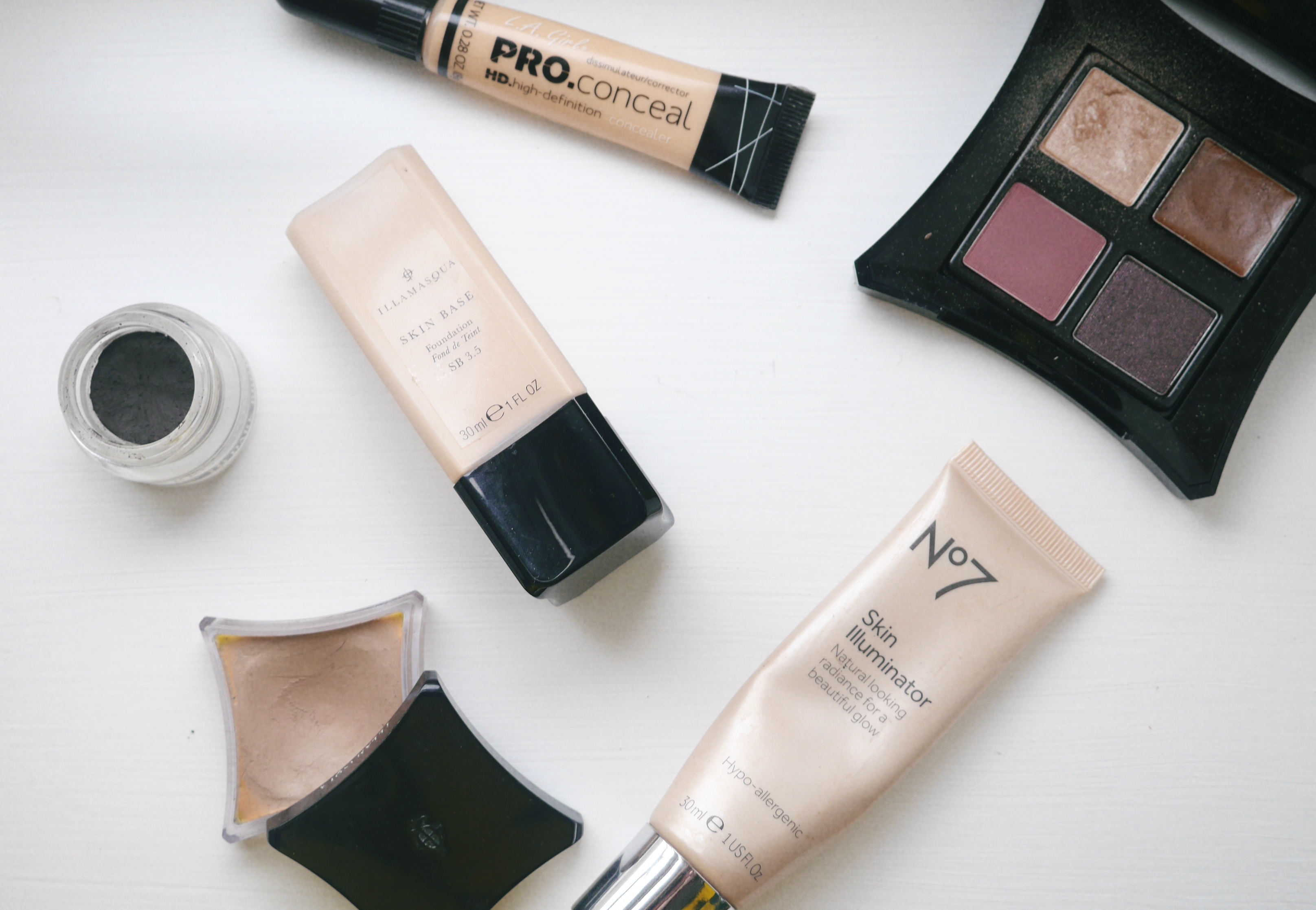 Eylure Brow Pomade|Illamasqua Skin Base|Illamasqua Complement Palette|No7 Skin Illuminator|Illasmasqua Hollow.