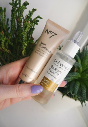 I then apply the NO7 Skin Illuminator to my forehead, cheek bones and down my nose, so where I would apply highlight over foundation if I was doing a full face of make up. It’s a super lightweight liquid highlighter which blends in easily, I just use my finger tips to apply. Although shimmery it doesn’t leave you looking like a disco ball but with a more ‘lit from within’ glow. You could then apply foundation or mix this in with your foundation if you prefer the end result would be similar but as in the picture above I just use concealer under my eyes and on any redness in my cheeks and that’s my base. Glowing and a little shiny but certainly not dry and dull looking.