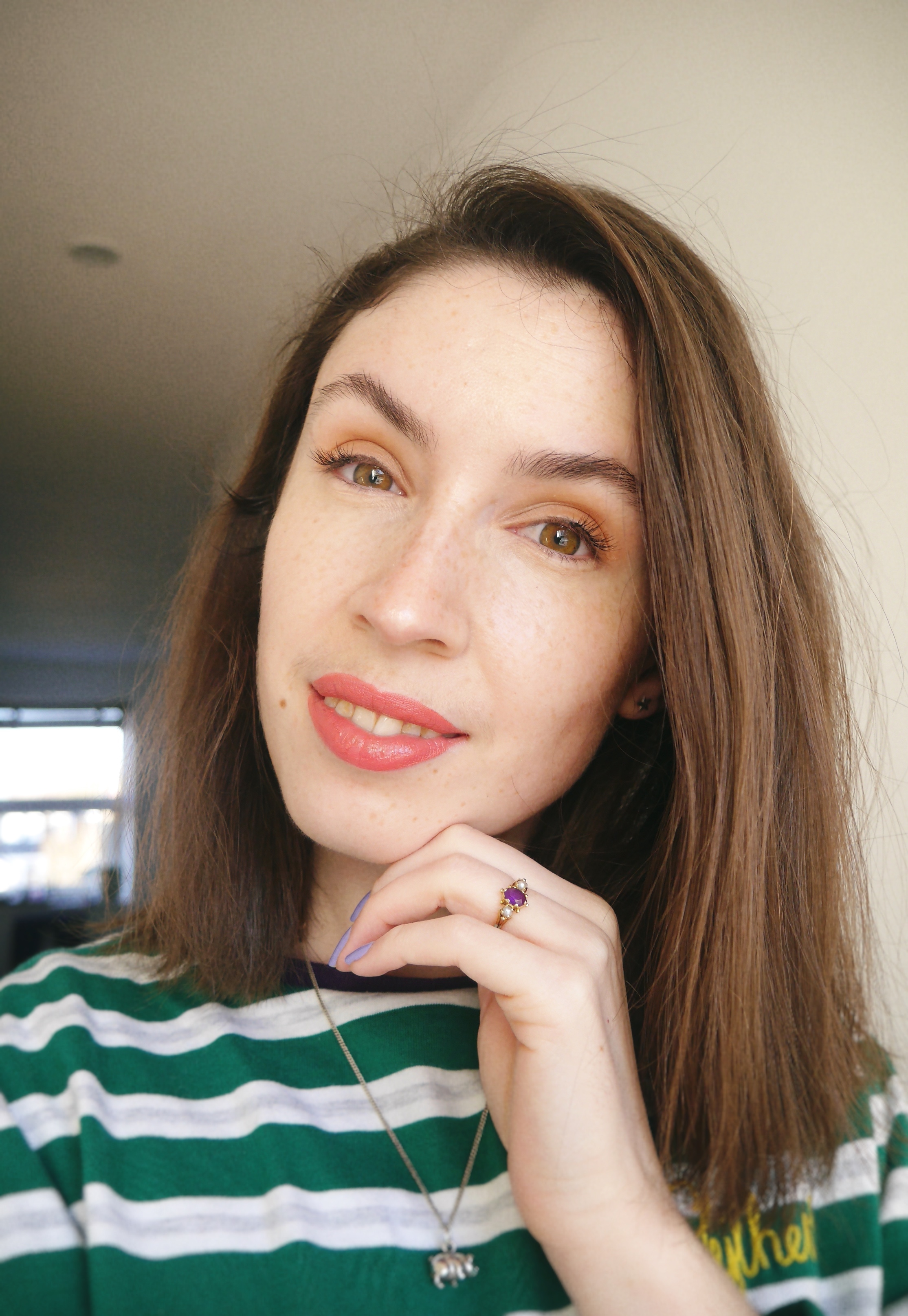 I then apply the NO7 Skin Illuminator to my forehead, cheek bones and down my nose, so where I would apply highlight over foundation if I was doing a full face of make up. It’s a super lightweight liquid highlighter which blends in easily, I just use my finger tips to apply. Although shimmery it doesn’t leave you looking like a disco ball but with a more ‘lit from within’ glow. You could then apply foundation or mix this in with your foundation if you prefer the end result would be similar but as in the picture above I just use concealer under my eyes and on any redness in my cheeks and that’s my base. Glowing and a little shiny but certainly not dry and dull looking.