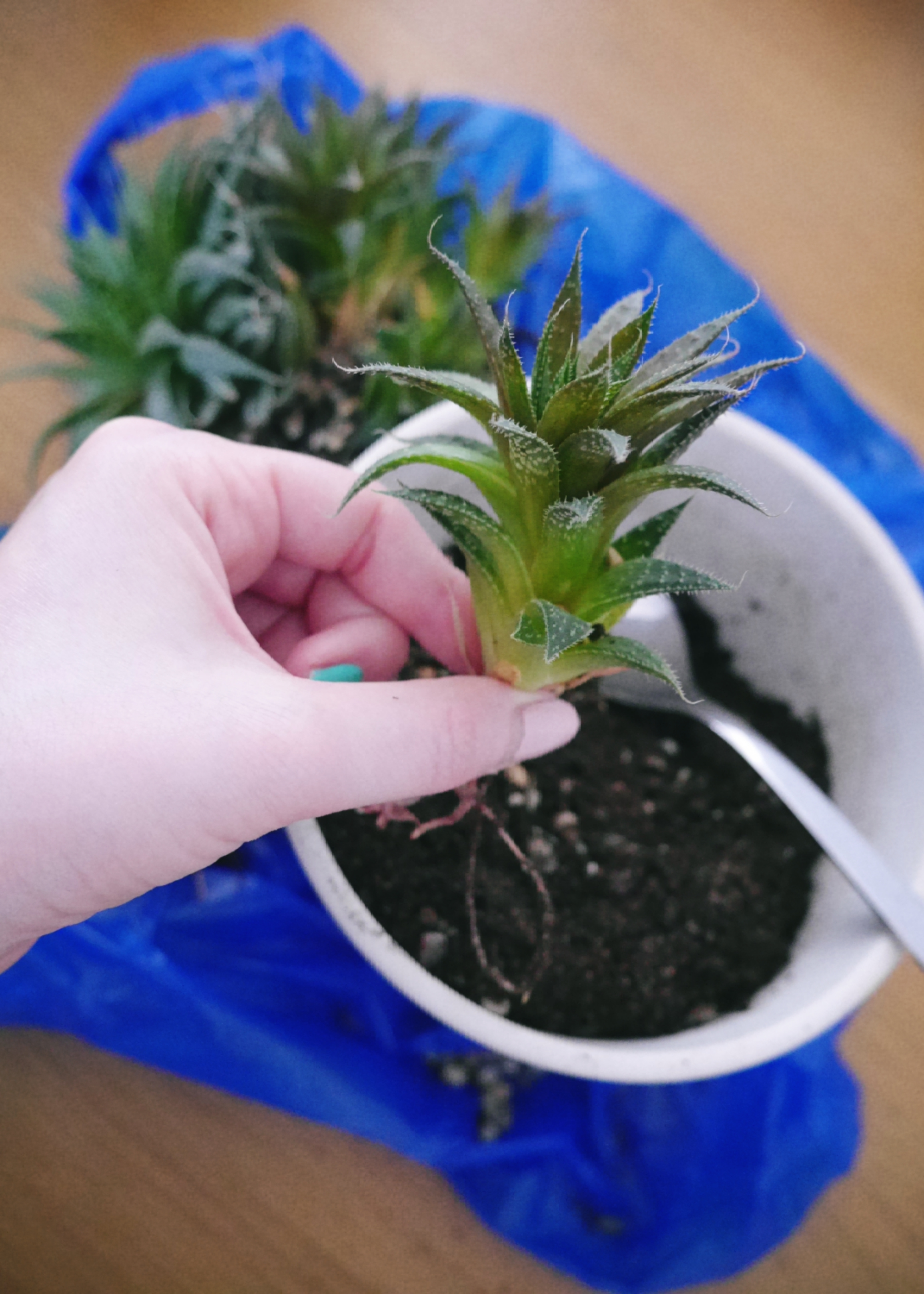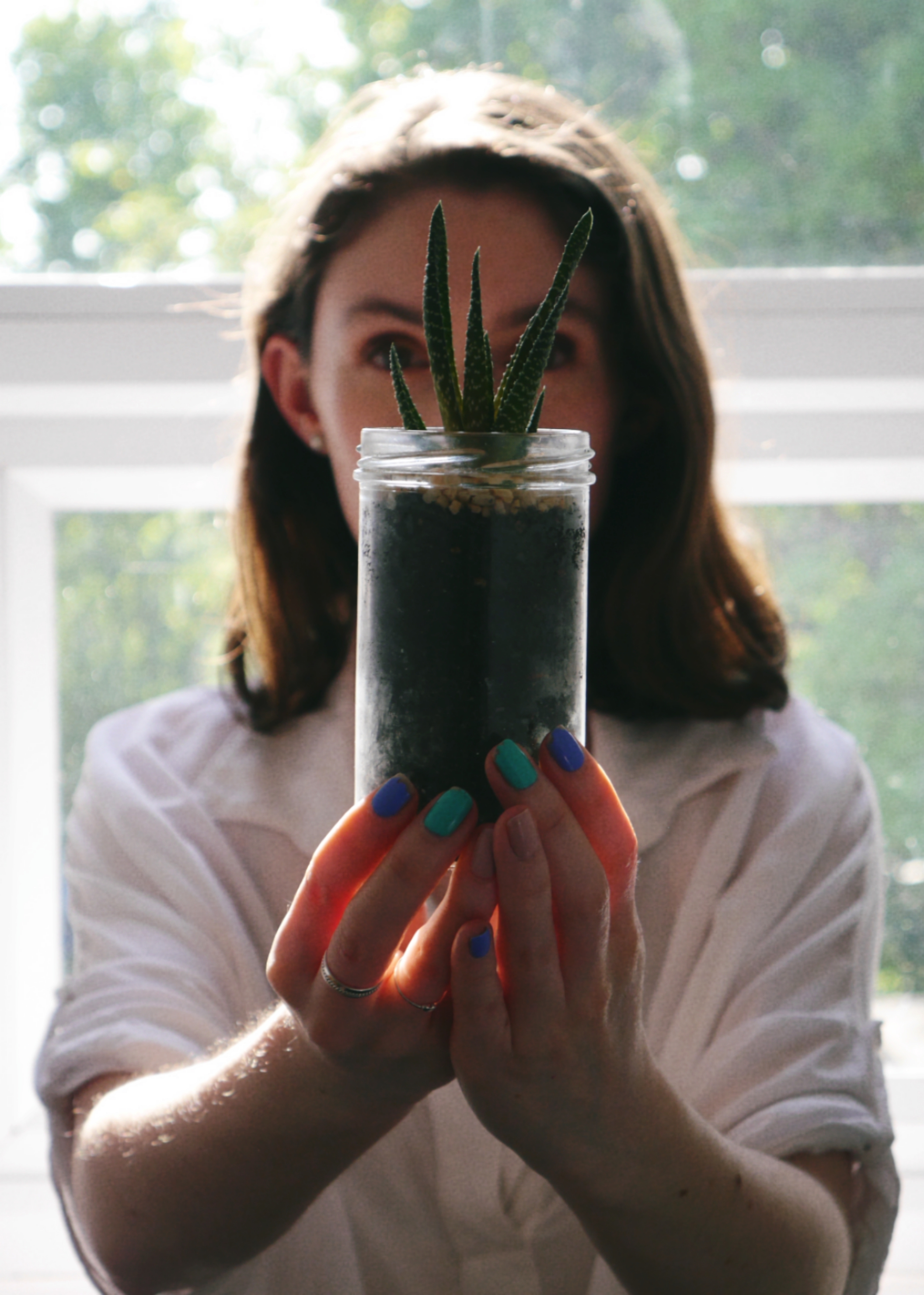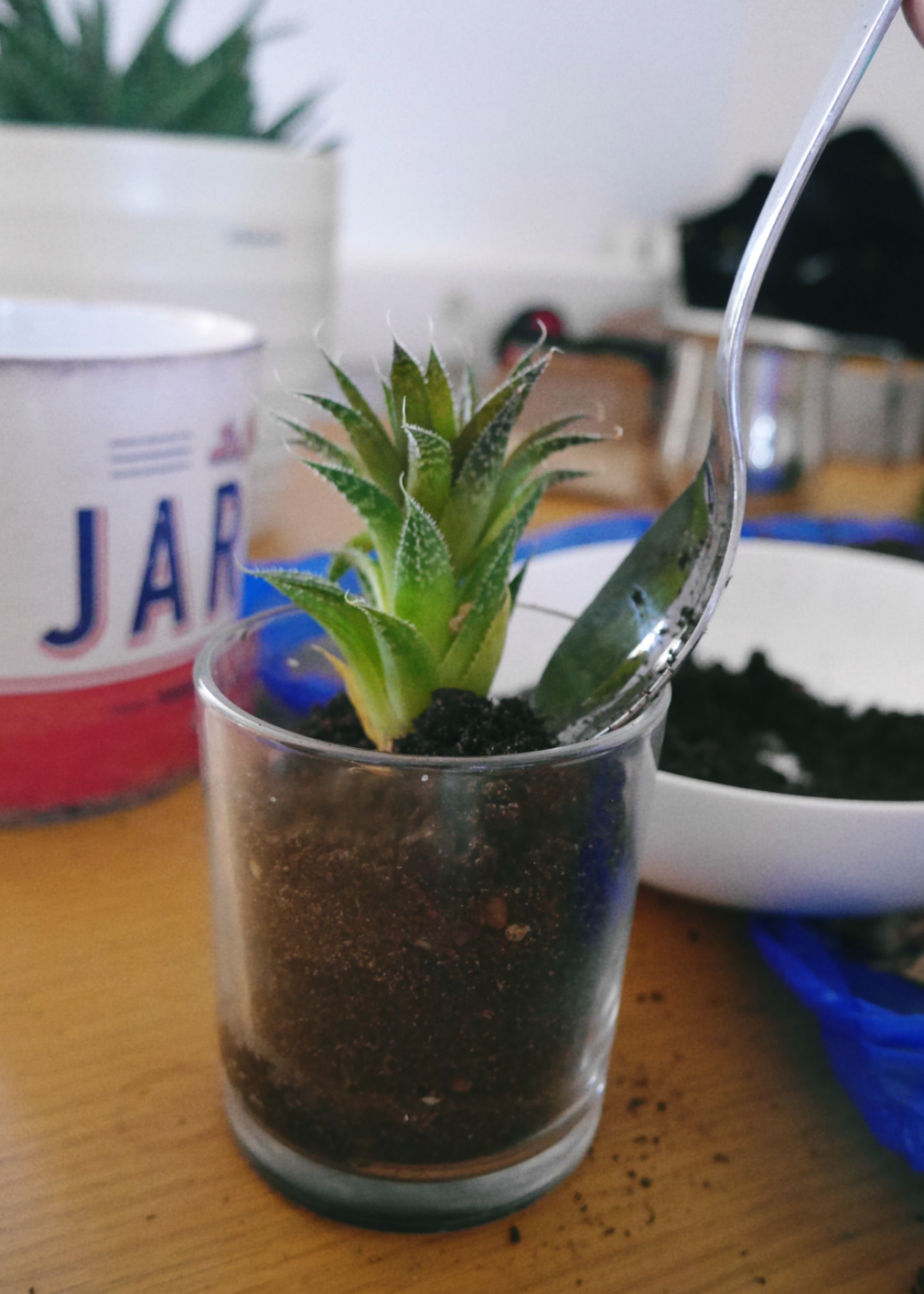 Add a small layer of new potting soil to the jar, place the succulent into the jar and add the rest of the soil around the root, making sure not to over fill the container and without letting the succulent sink to low. If you don’t have a lot of re-potting soil you can mix it with the soil from the old pot as long as the bottom mix is all new.