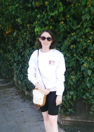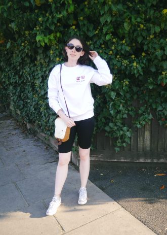 If you see me in the next few weeks this is probably what I’ll be wearing because it’s so bloomin’ comfortable! I absolutely love this Sassy Spud Jumper which says ‘Eat Jam Not Ham’ it’s cute, cosy and carries and important message. They are made from 100% cotton and are printed using vegan inks in Ireland. I’m not normally one to wear a bright white jumper but this one works perfectly with the eye catching embroidery. I’m still loving wearing cycling shorts even as we transition into autumn and I now fully understand the hype behind them. See how I style them with a shirt here.
