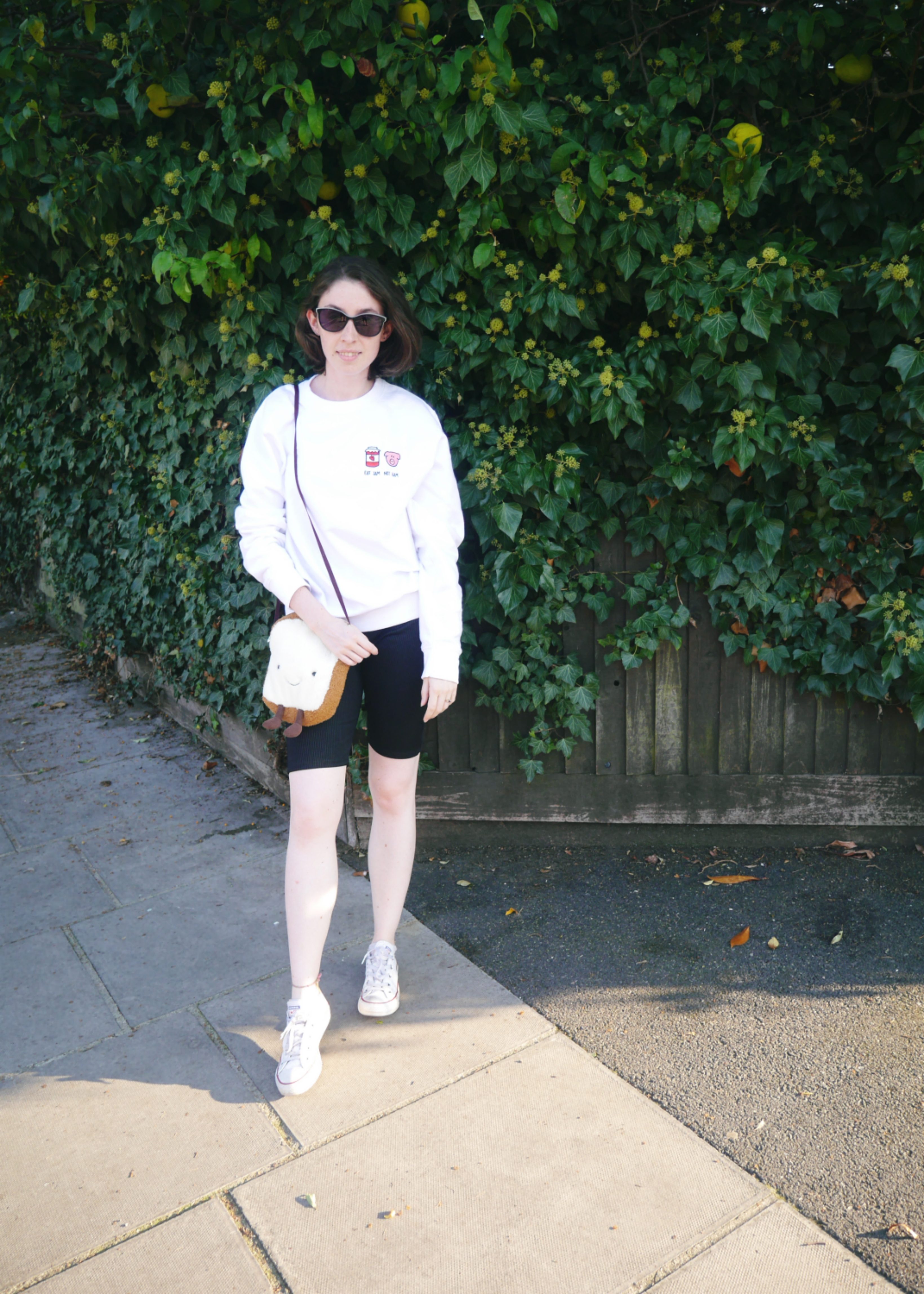 If you see me in the next few weeks this is probably what I’ll be wearing because it’s so bloomin’ comfortable! I absolutely love this Sassy Spud Jumper which says ‘Eat Jam Not Ham’ it’s cute, cosy and carries and important message. They are made from 100% cotton and are printed using vegan inks in Ireland. I’m not normally one to wear a bright white jumper but this one works perfectly with the eye catching embroidery. I’m still loving wearing cycling shorts even as we transition into autumn and I now fully understand the hype behind them. See how I style them with a shirt here.