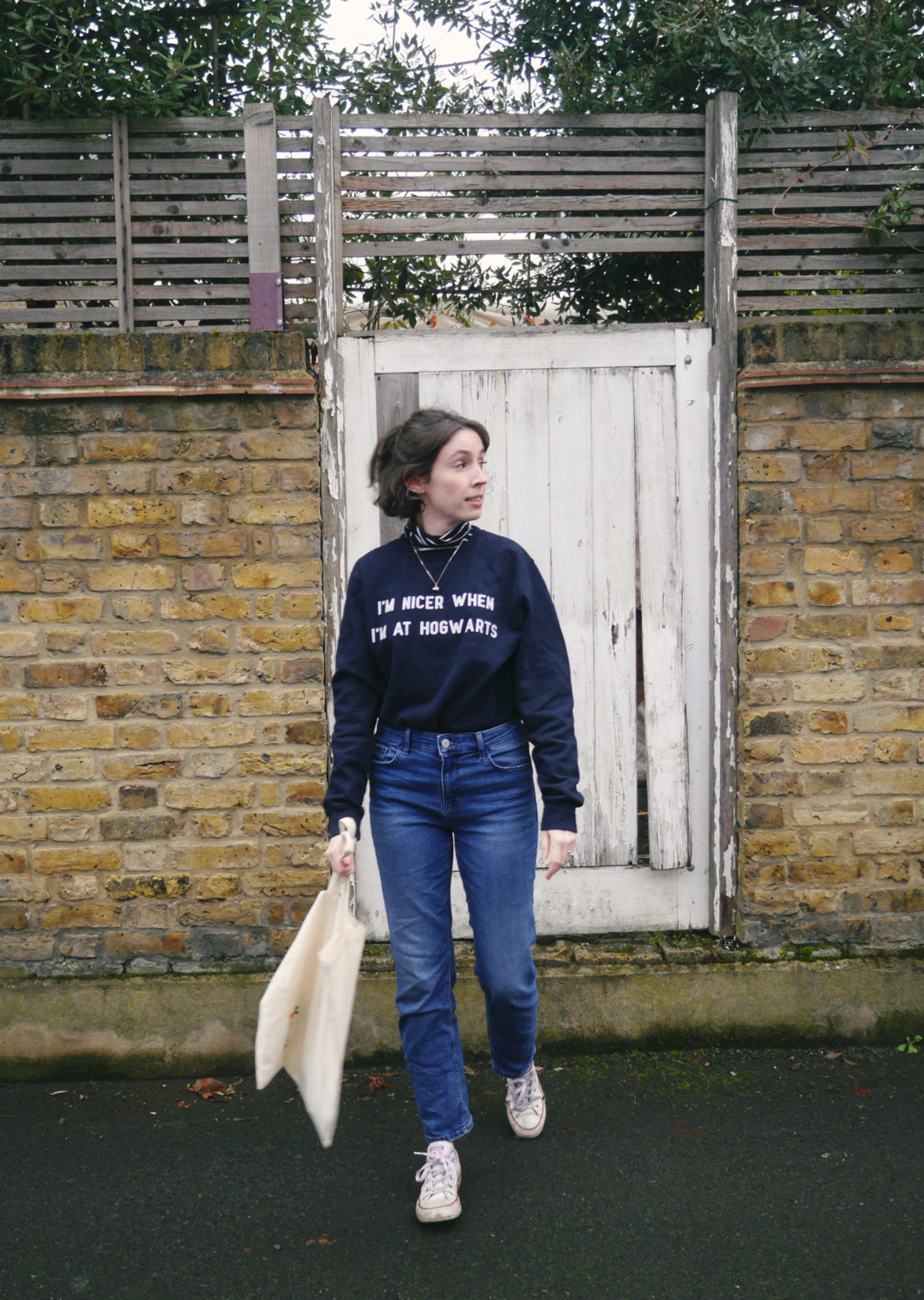 I will always be a blue denim lover and I am currently loving styling them with a slogan sweatshirt and a roll neck underneath. It’s too cold not to be layering right now in the UK and you might as well show off your layers. This is very much my lock down daily walk style and it’s so comfy and cosy.