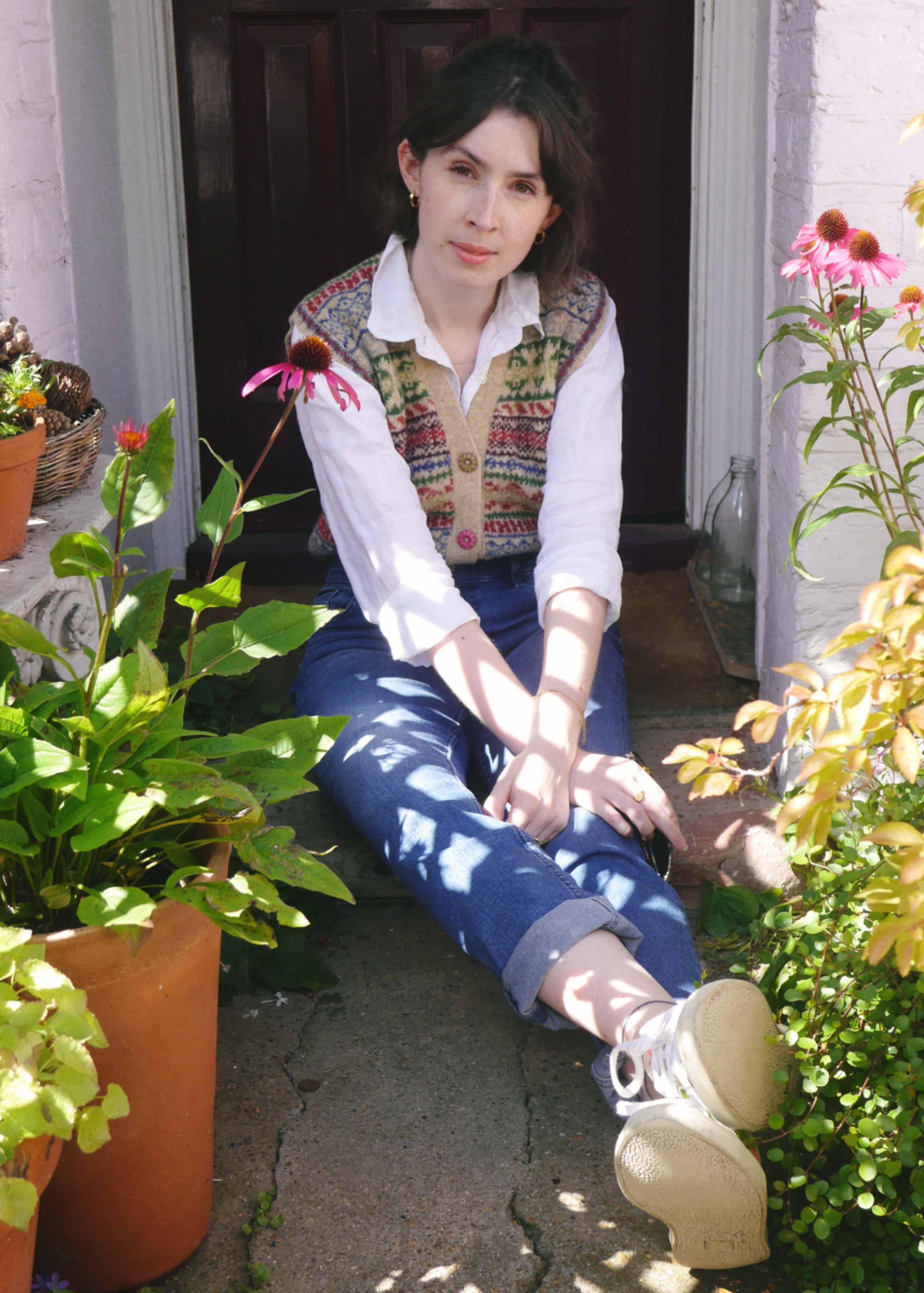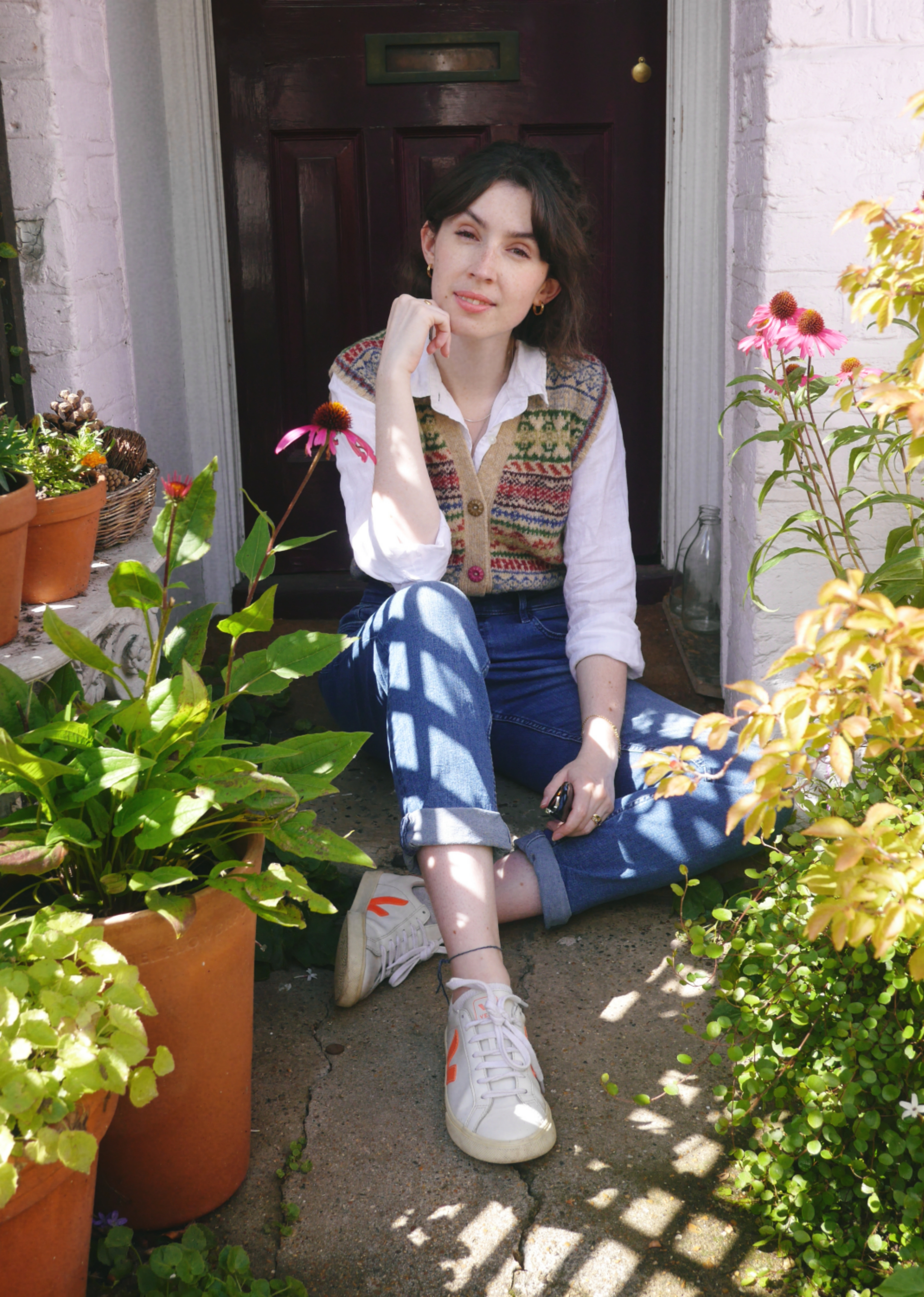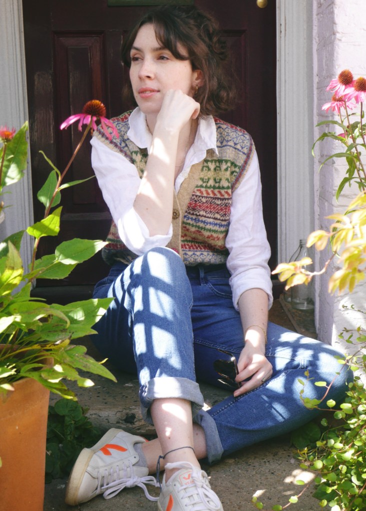 Wearing a hand made sweater vest, secondhand shirt, Marks & Spencer jeans (relatively ethically made – could be better), trainers are Veja.