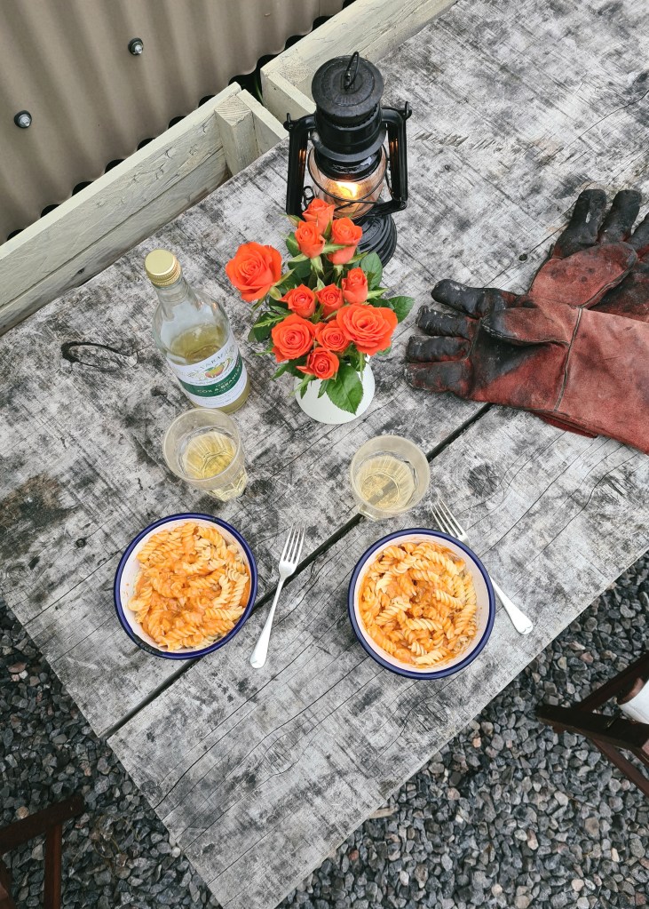 Back at our base with a cup of tea in hand, Mum and I marched off to stock up on firewood to get dinner started. I reckon you could cook a fancy feast if you put your mind to it but we stuck to a simple classic; pasta with sauce.