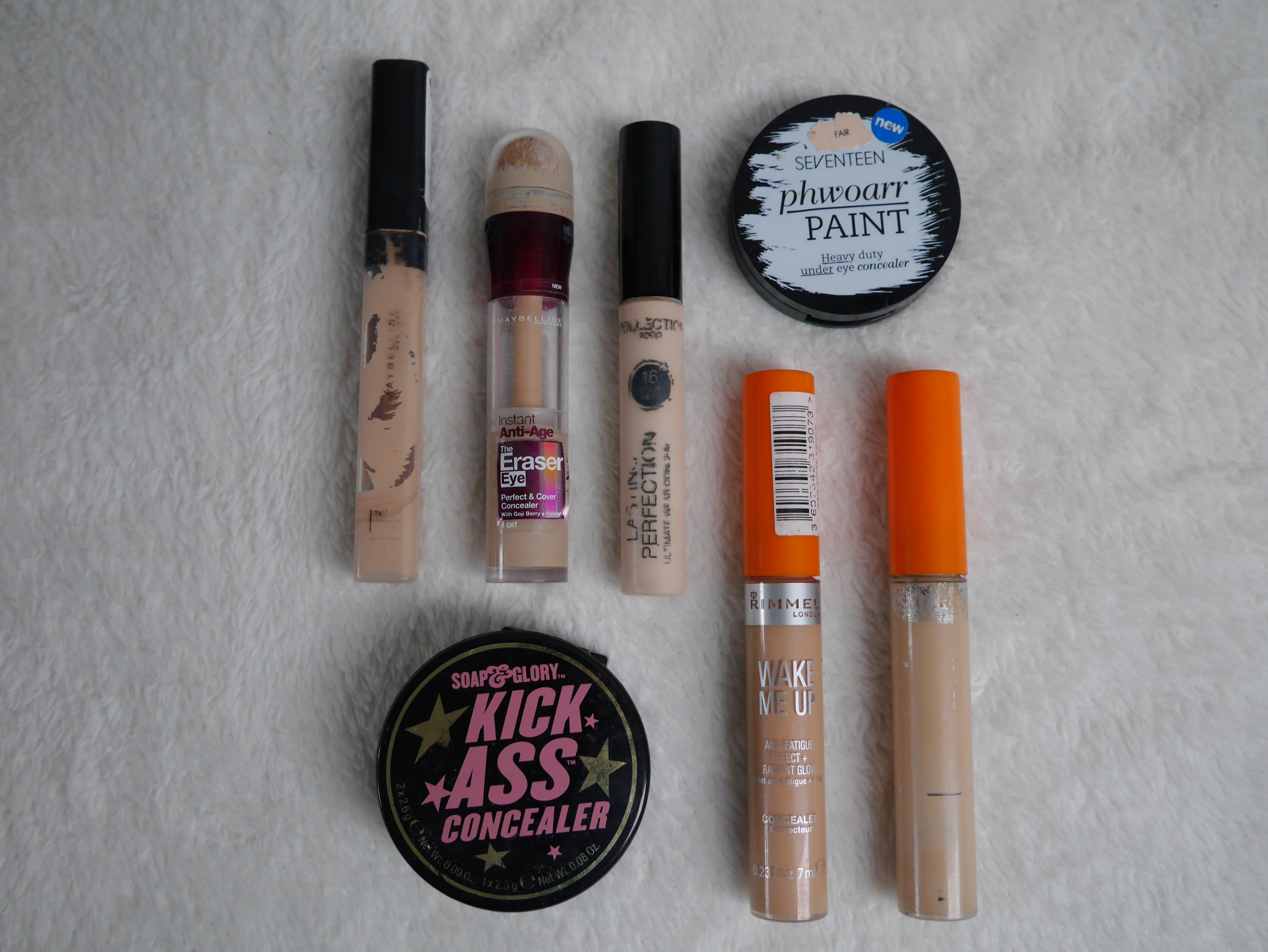 Maybelline Fit Me|Maybelline The Eraser Eye|Collection Lasting Perfection|Seventeen Phwoarr Paint|Soap&Glory Kick Ass Concealer|Rimmel Wake Me Up.
