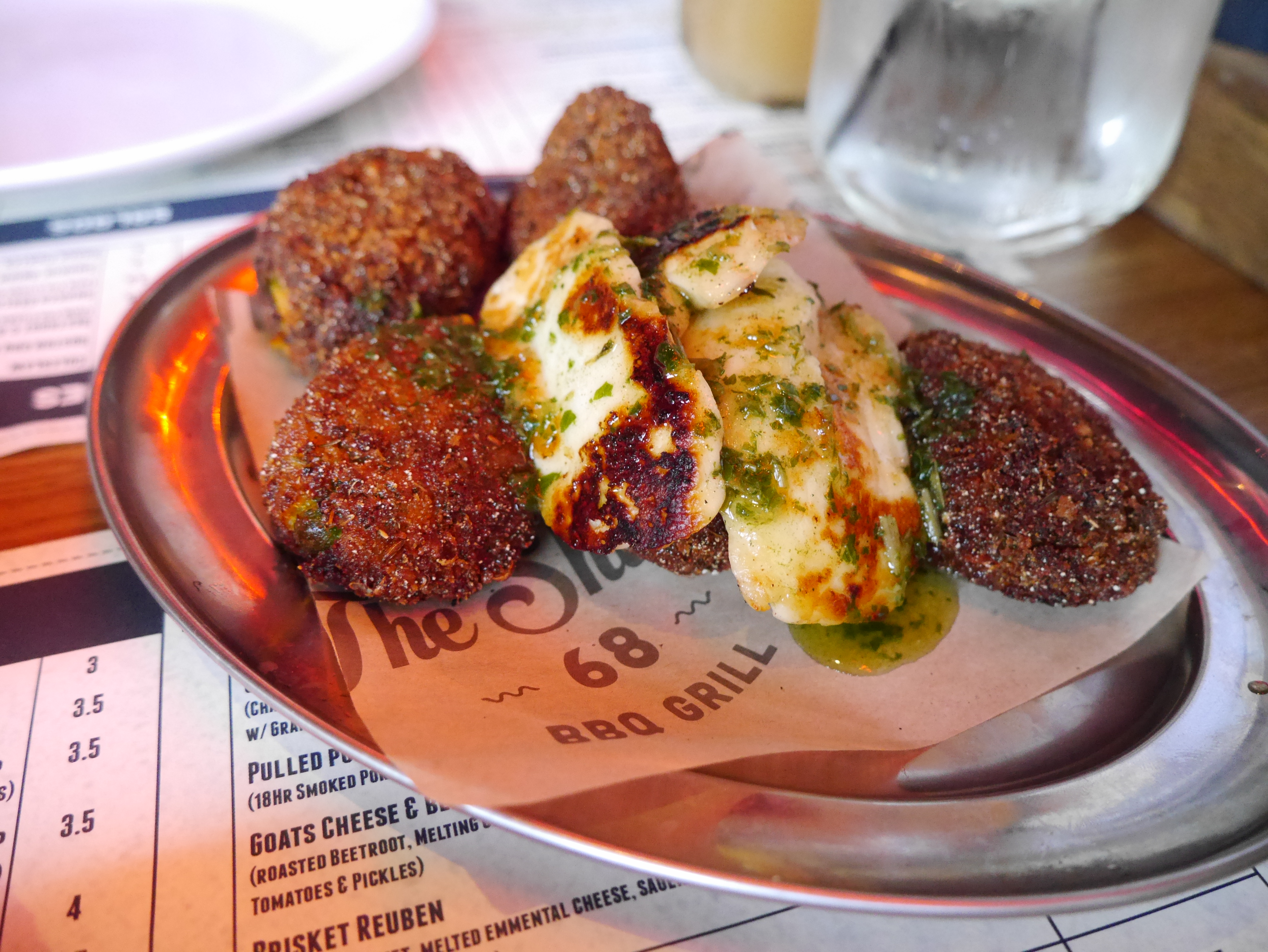 The whole idea of the restaurant is sharing platters and mini plates. We decided to share two starters before the main event. Pork Belly Bites – quite literally some of the best pork I have ever tasted and Grilled Halloumi with Sweet Potato, Broad Bean and Pea Wings.