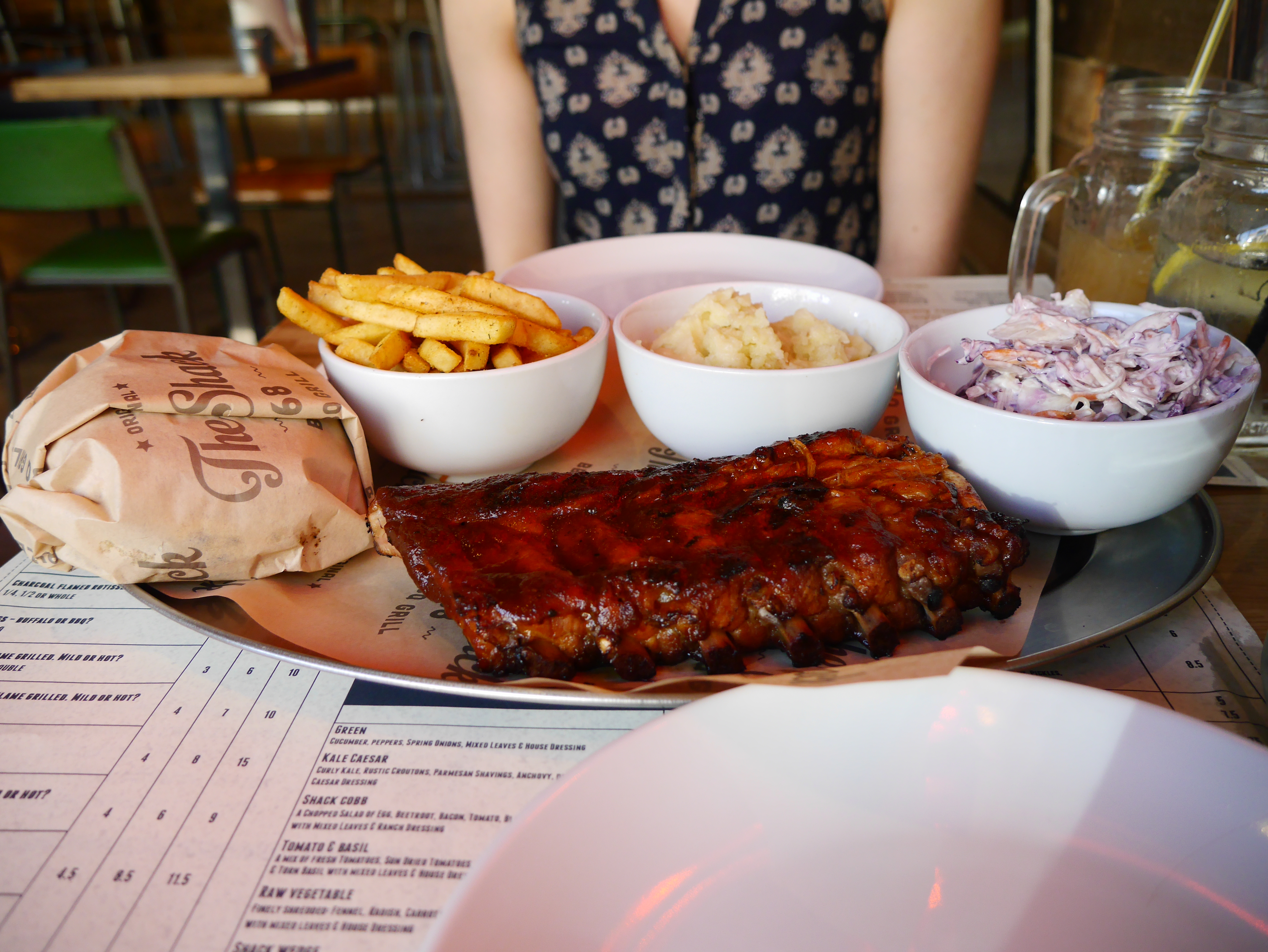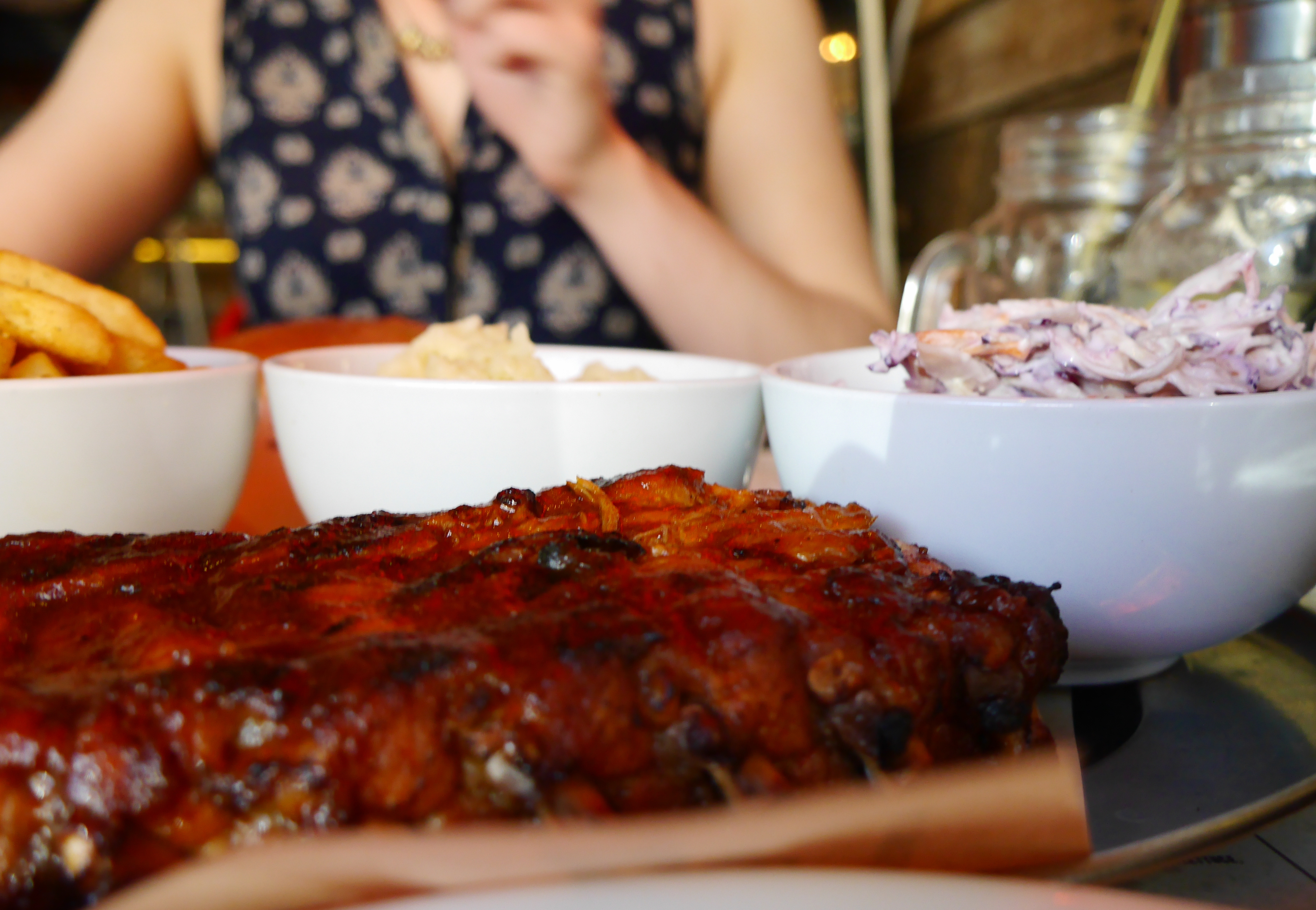 Although we were already a little full from the starters we cracked into the main event. K went for a classic Cheese Burger with a side of Fries and Slaw whereas I went for a 1/2 rack of ribs with a side of mash. The ribs, oh my the ribs. Meat that melted off the bone smothered in the most amazing sauce paired with smooth, creamy mash.
