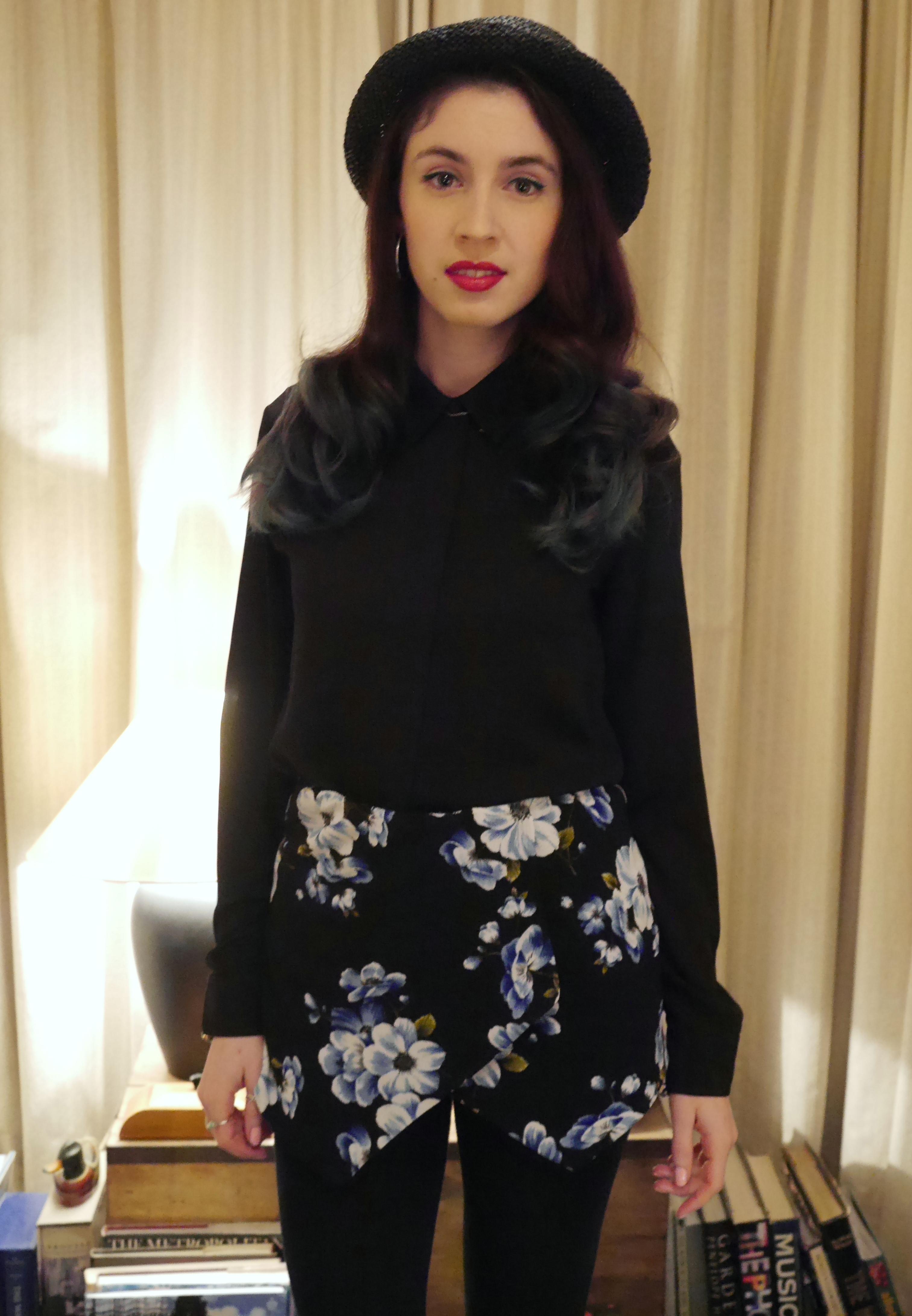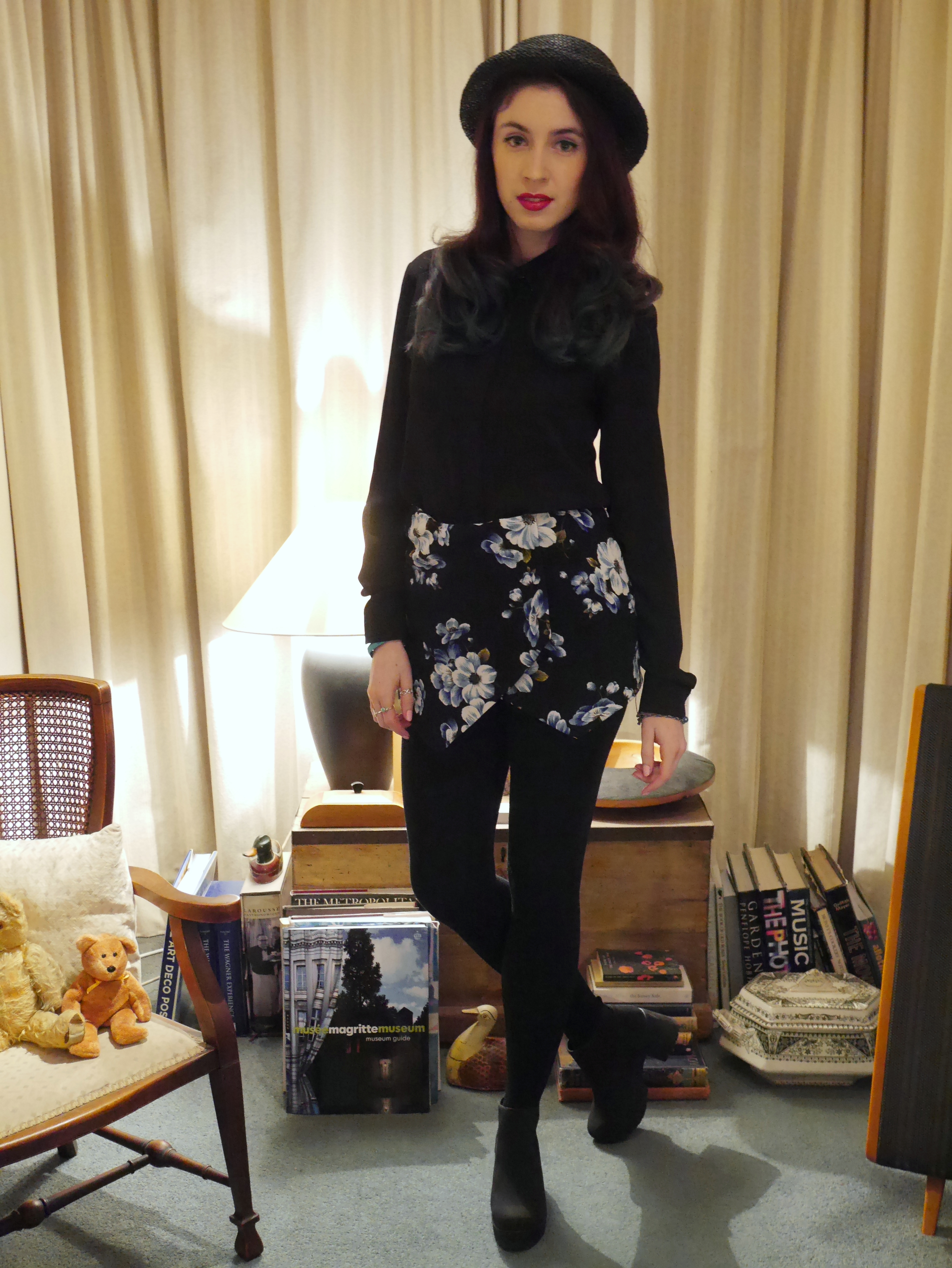 Nothing beats a black chiffon shirt it can automatically make a casual outfit look smart. I tucked it into this super cute floral skort from New Look; I love a skort all the femininity of a skirt with the security of shorts in case you are as clumsy as I am and tend to flash people if you’re not careful. To lengthen my legs a little I donned my favourite black boots from ASOS, they are a really chunky style so add a slightly ‘rough’ edge to what could be quite a preppy outfit. To finish the outfit I popped on my trusty bowler hat from Topshop and added this awesome dinosaur necklace, revealing a little of my inner geek.